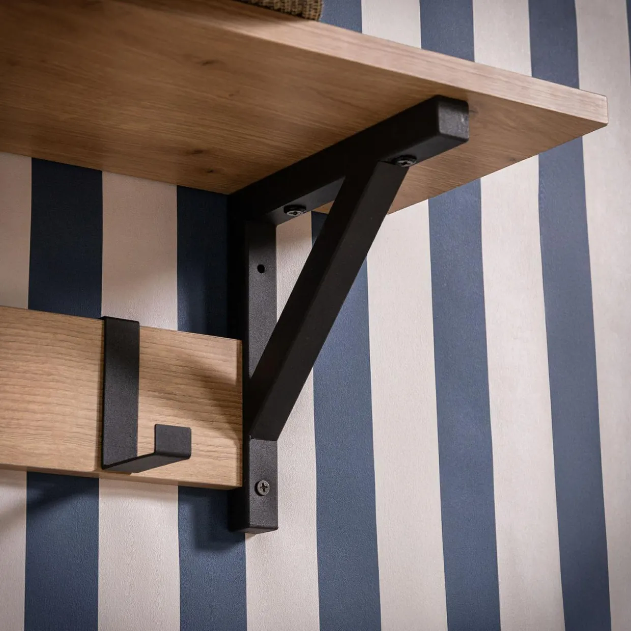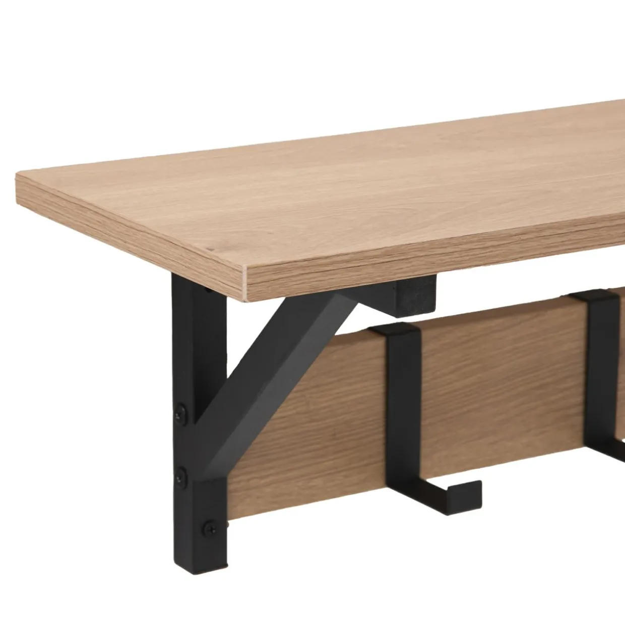 Korpus wieszaka wykończony jest okleiną drewnopodobną. Rysunek słojów i sęków przypomina naturalne drewno dębowe.