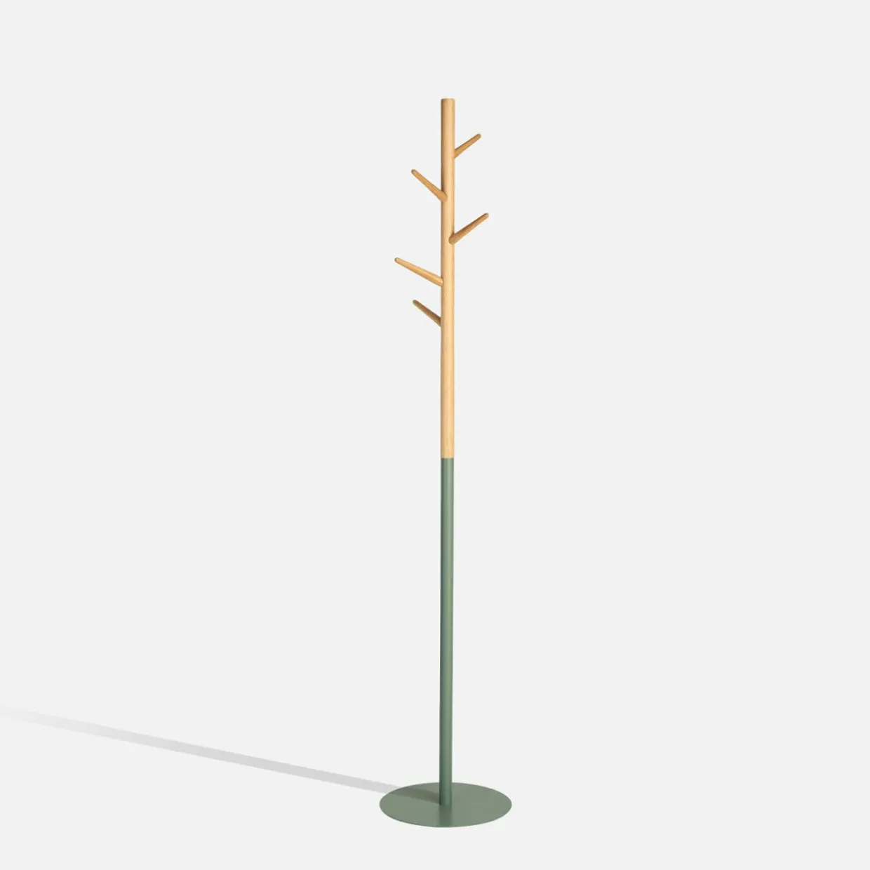 Z pewnością docenisz naturalne materiały – wieszak NANTO wykonany został z naturalnego drewna kauczukowego o jasnym wybarwieniu. Zielona metalowa podstawa dodaje nowoczesnego akcentu w stylu urban jungle i boho.