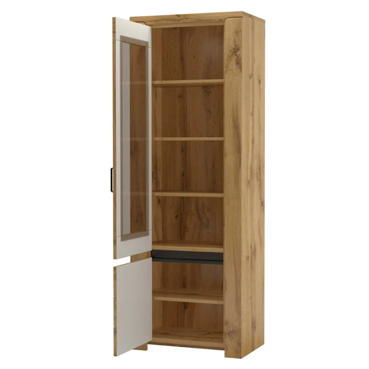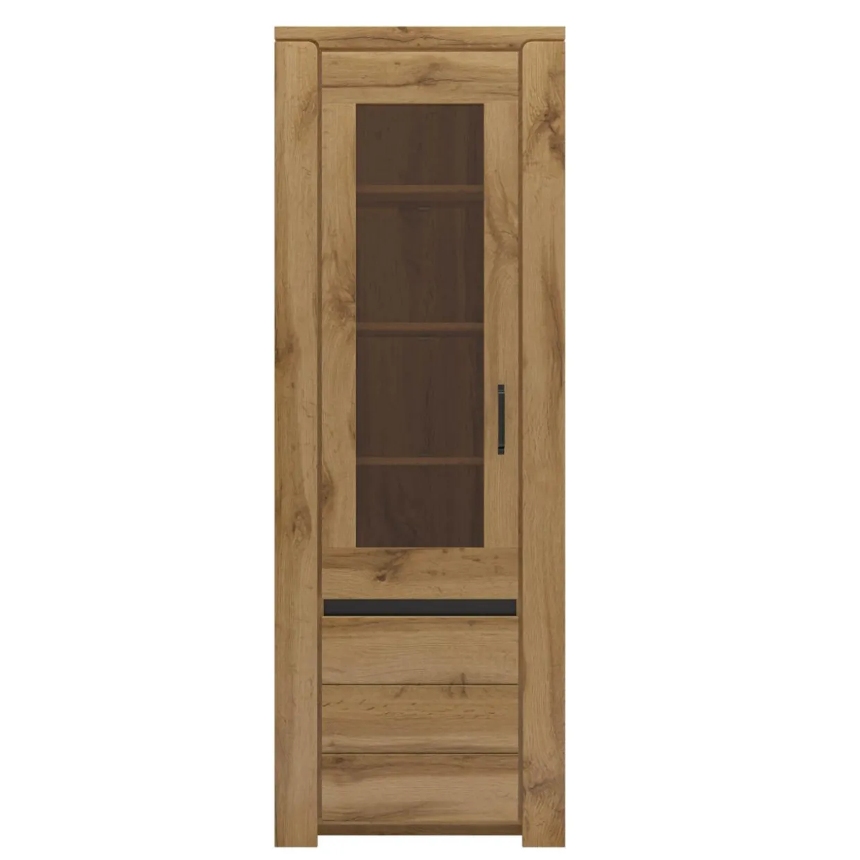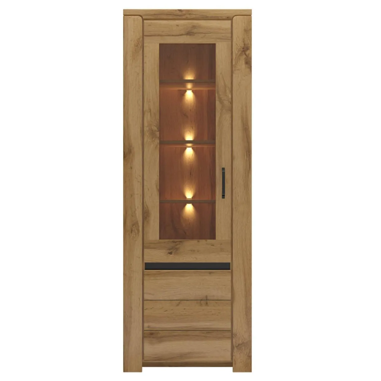 Ciepły odcień drewna, brązowe szyby w drzwiach witryny i oświetlenie LED (opcjonalnie) wprowadzają do wnętrza przytulny klimat. Wraz z pozostałymi meblami z serii, witryna tworzy aranżację o sielskim charakterze.