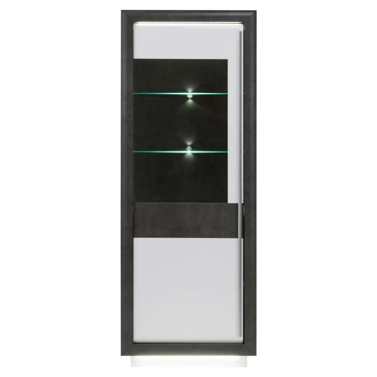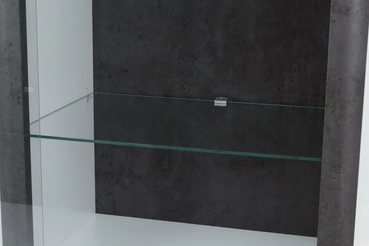 Zawiasy w drzwiach wyposażone w hamulce sprawiają, że drzwi nie hałasują podczas zamykania. Bogactwo wyposażenia wieńczy oświetlenie LED w postaci dwóch listew montowanych pod wieńcem i cokołem oraz dodatkowe oświetlenie na półki szklane. Sterowanie oświetleniem odbywa się za pomocą systemu dotykowego umieszczanego na korpusie meble. Rozwiązanie to ukrywa okablowanie i włączniki. Wystarczy jeden dotyk.