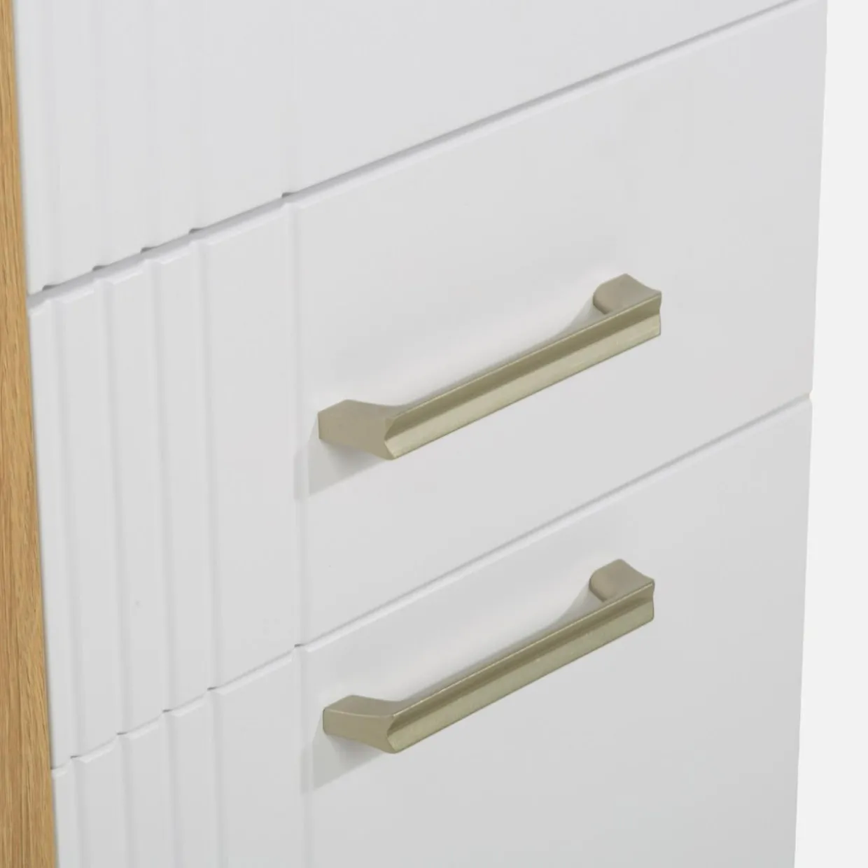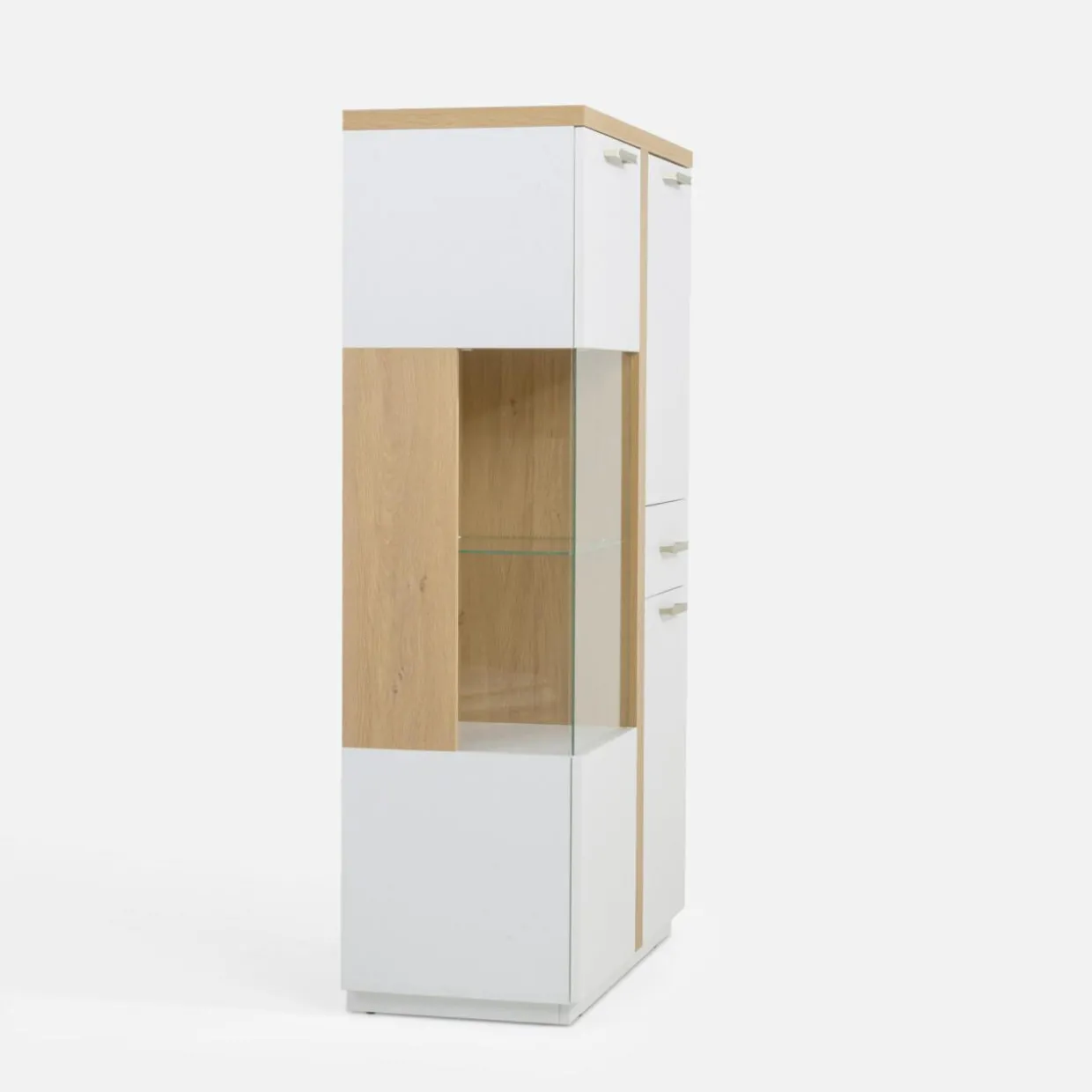 - Piękny wygląd: biała witryna z dodatkiem barwy kamiennego dębu dobrze sprawdza się w stylu nowoczesnym.