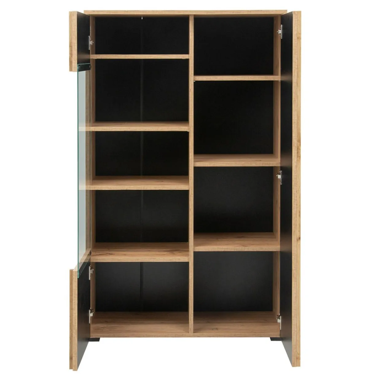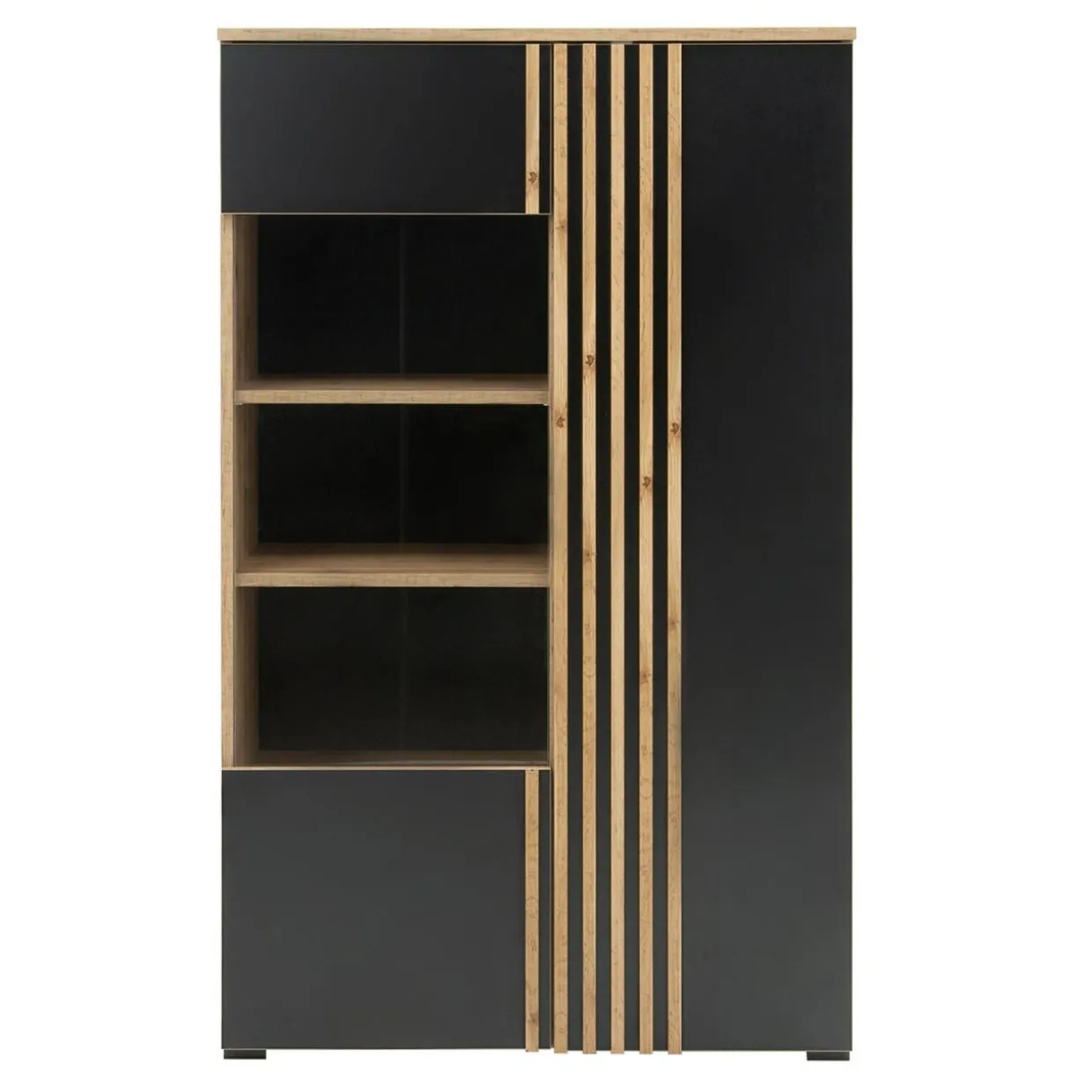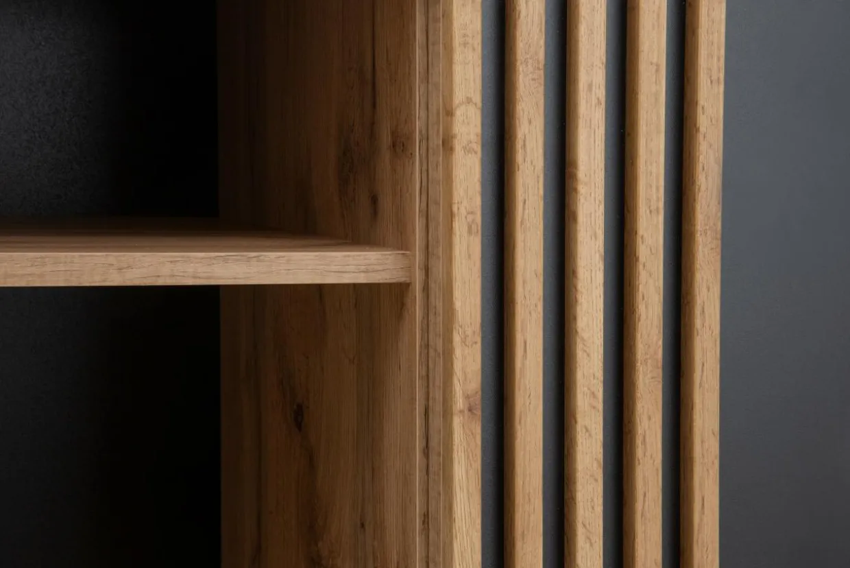 - Ciepły kolor dębu wotan, czarne, minimalistyczne fronty i ozdobne lamele – całość prezentuje się elegancko i sprawi, że Twój salon ozdobi współczesny design.