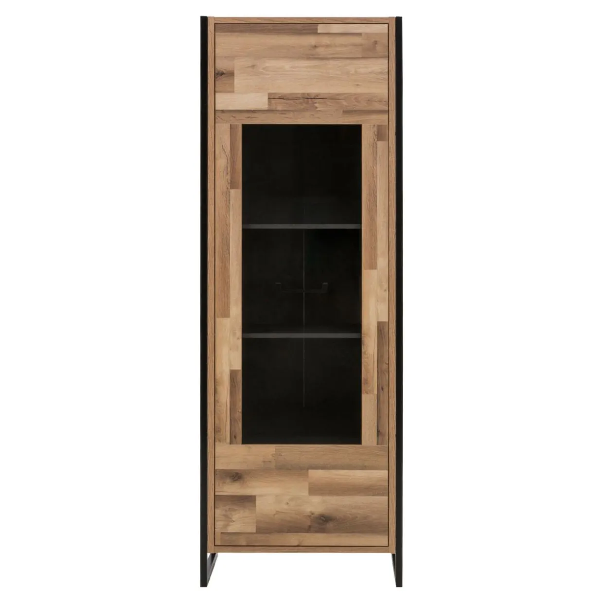 Witryna została wykonana z płyty meblowej wykończonej folią. Hartowane szkło na froncie posiada grubość 4 mm. Gustownym dopełnieniem całości są metalowe uchwyty w czarnym kolorze, które korespondują z profilem spełniającym role nóżek mebla.