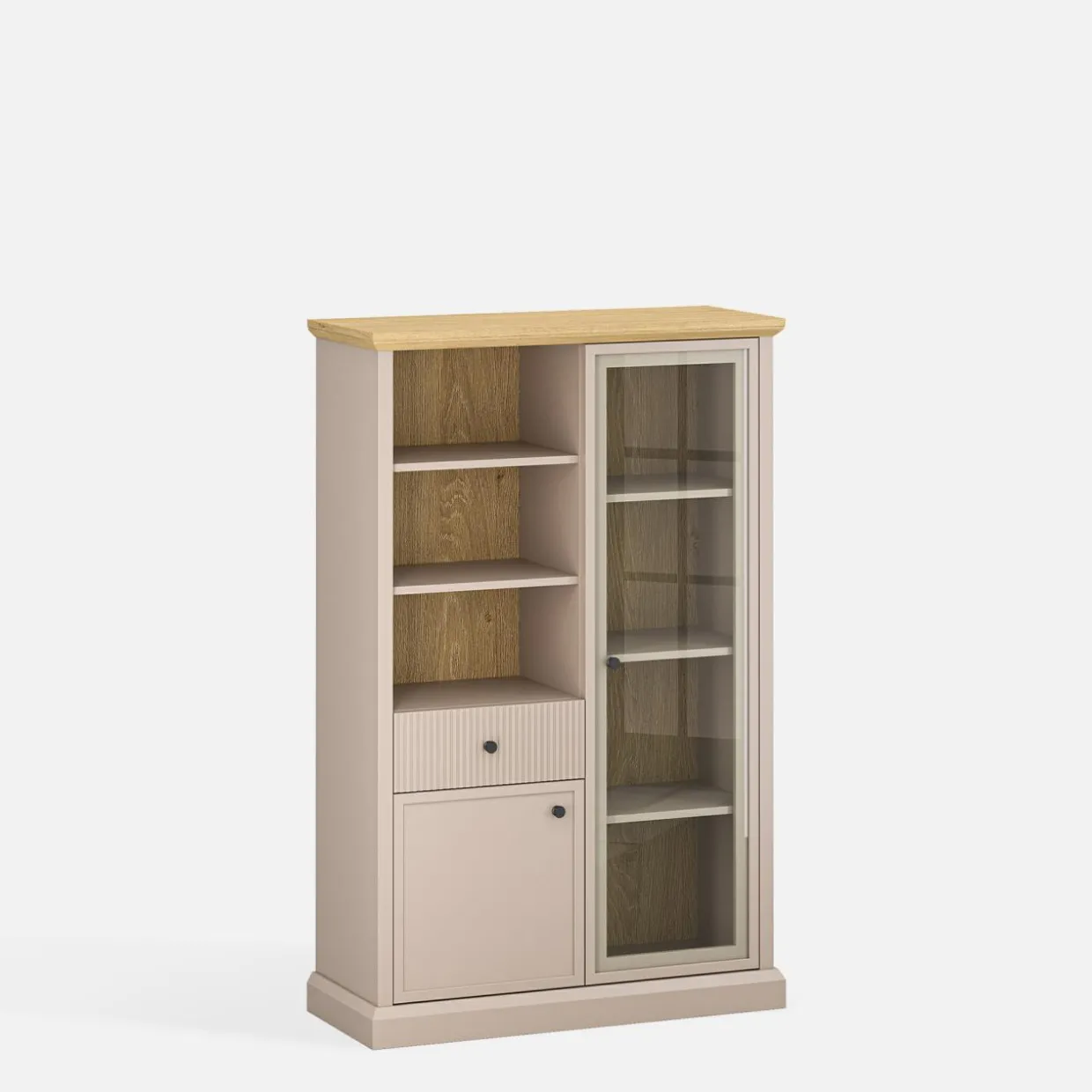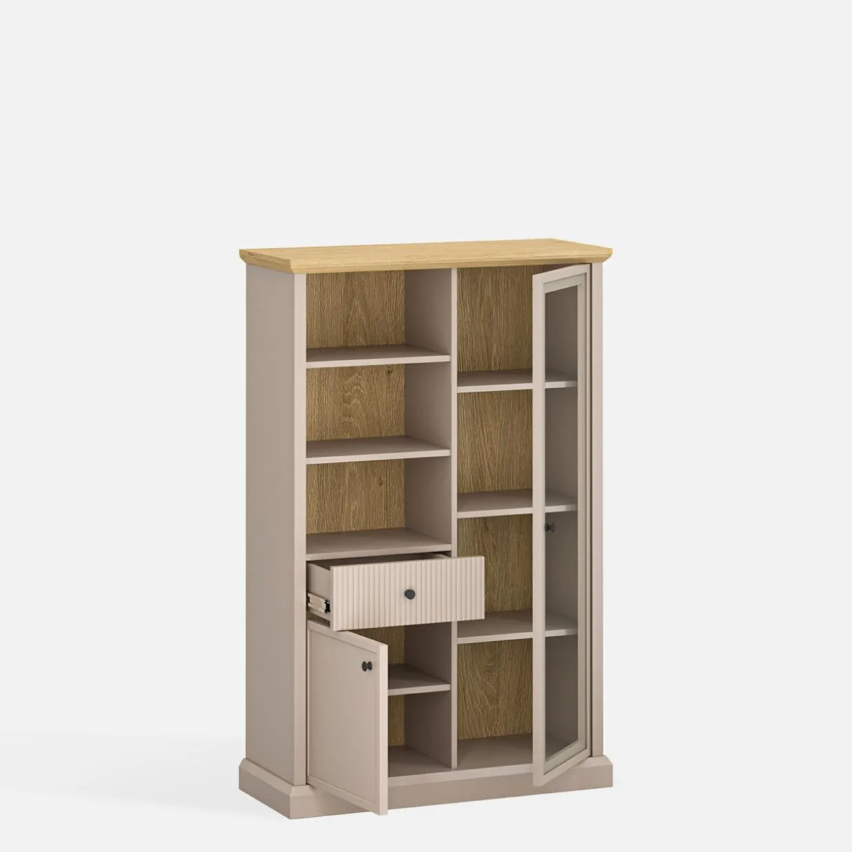 Witryna niska IDELLO w odcieniach taupe i dębu kamiennego to mebel, który stanowią doskonałe rozwiązanie do przechowywania i wyeksponowania ulubionych przedmiotów.