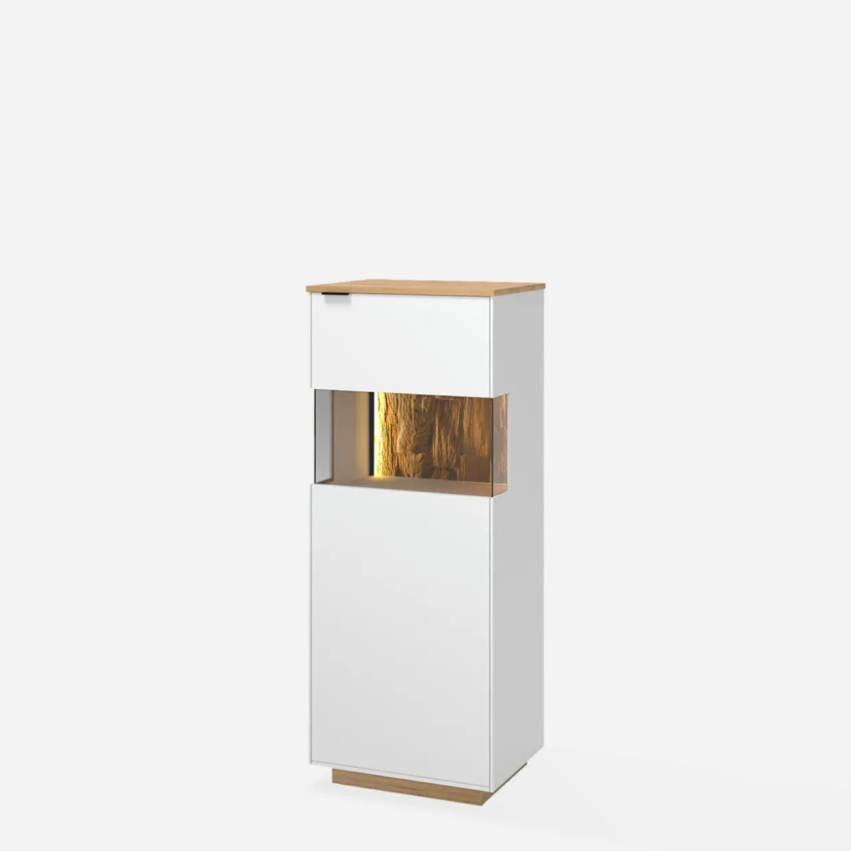 Niska witryna BREMEN świetnie sprawdzi się jako dodatkowe zabudowa między pomieszczeniami lub w rogu jadalni. Niska i wąska zmieści się blisko stołu, a wszystkie naczynia i akcesoria będą w wygodnym miejscu pod ręką.