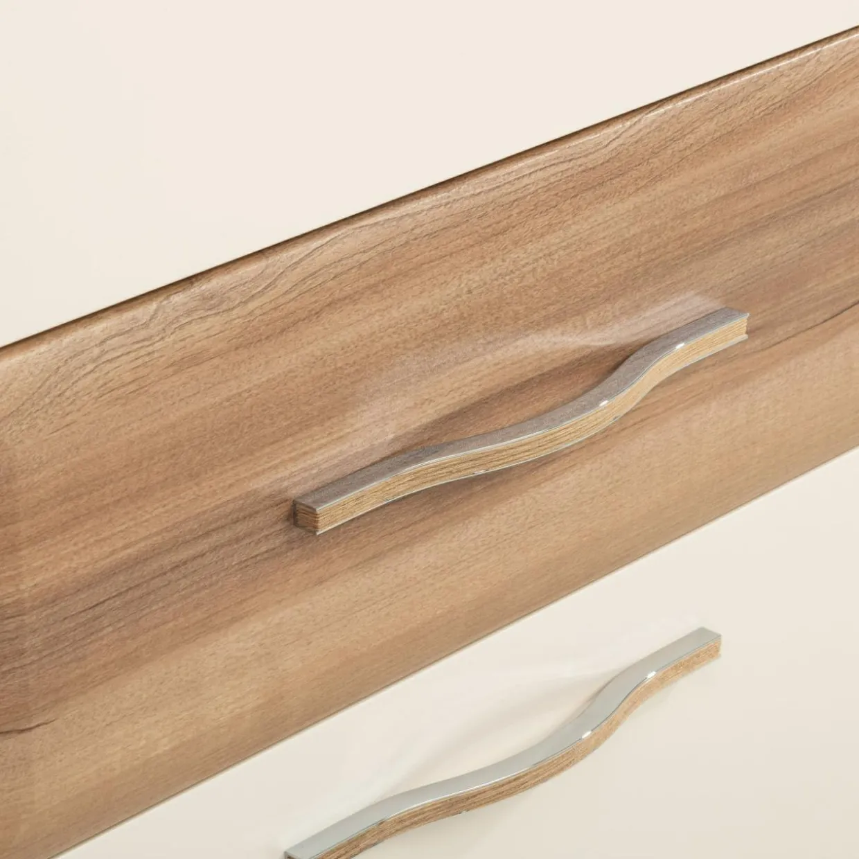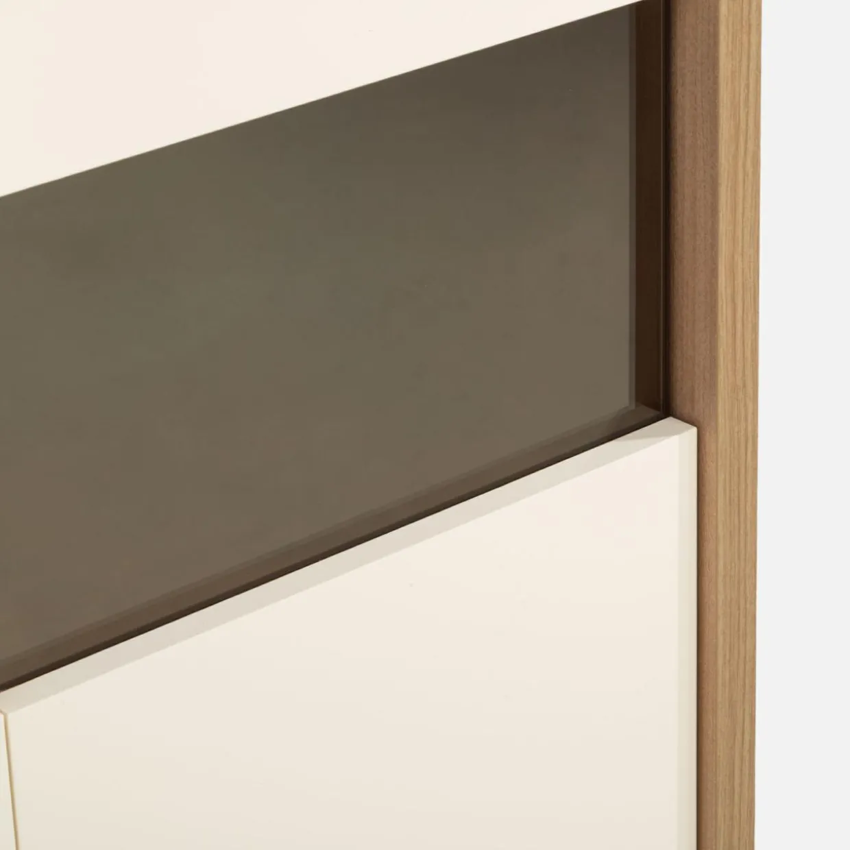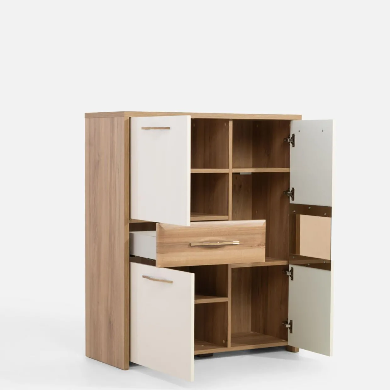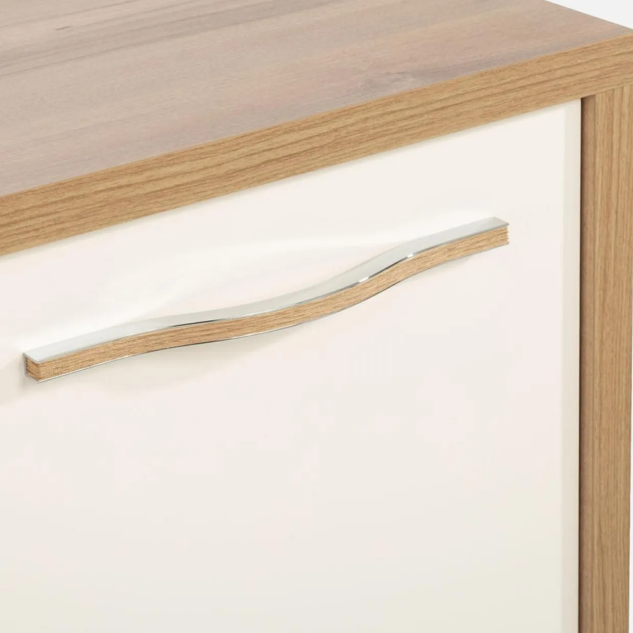 Witryna GALA niska to kompaktowy, a jednocześnie elegancki mebel o nowoczesnym wyglądzie. Wykończenie w kolorze drewna i beżowym wysokim połysku tworzy stylowy kontrast, idealny do współczesnych wnętrz.