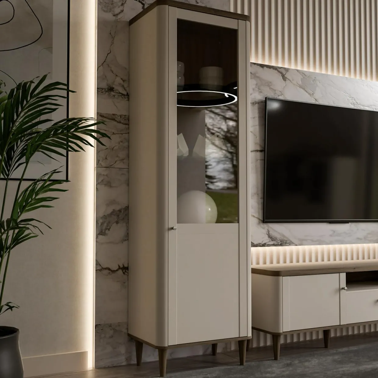 - Ciepły piaskowy beż z elementami dębu valencia tworzą nowoczesną kolekcję, sprzyjającą odpoczynkowi.