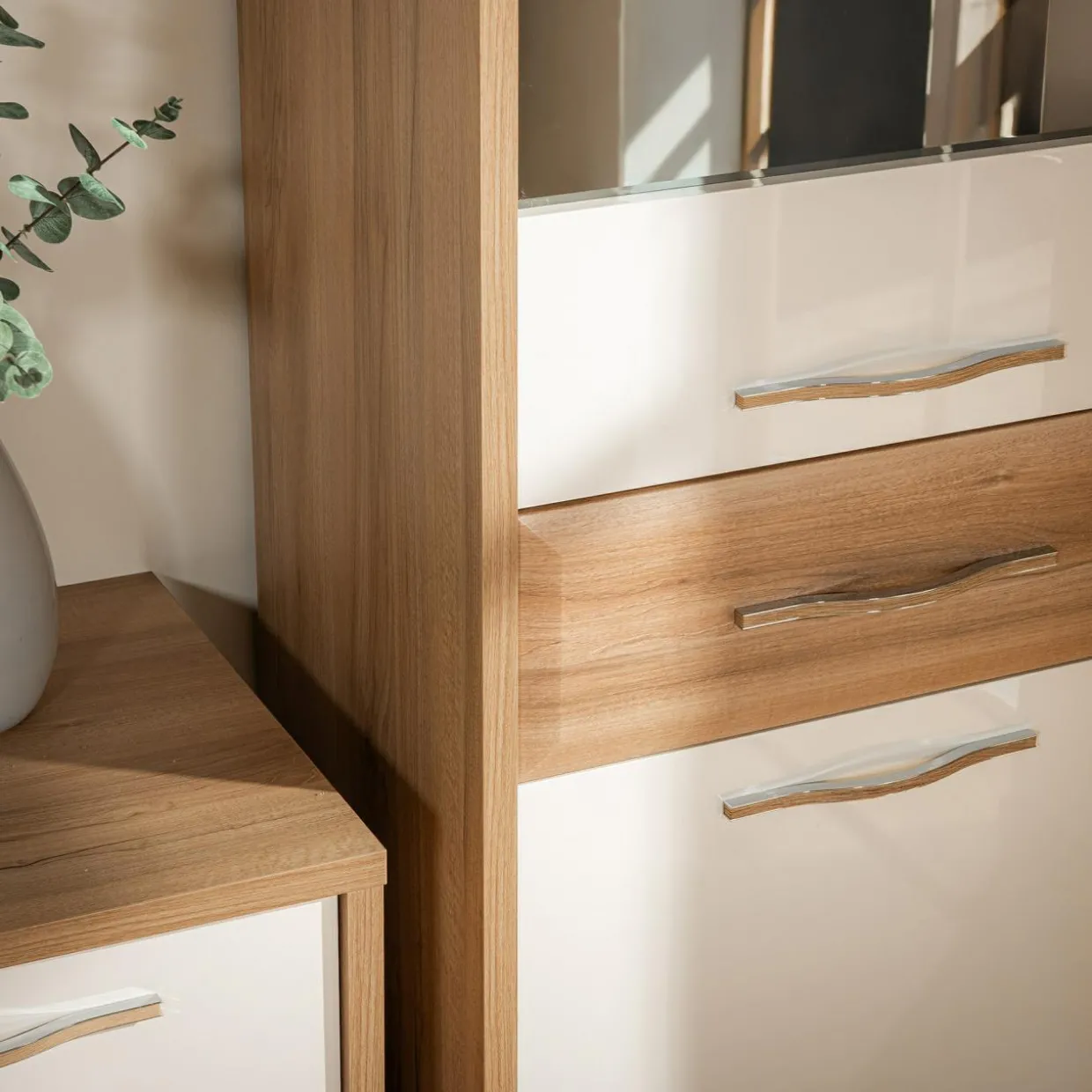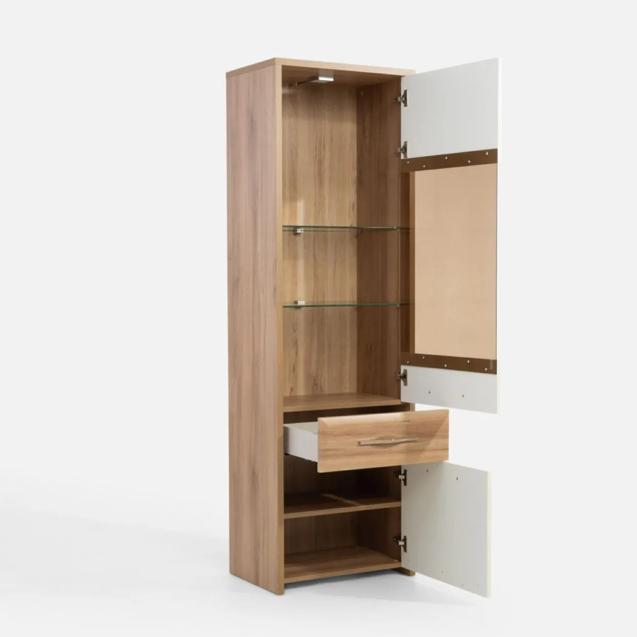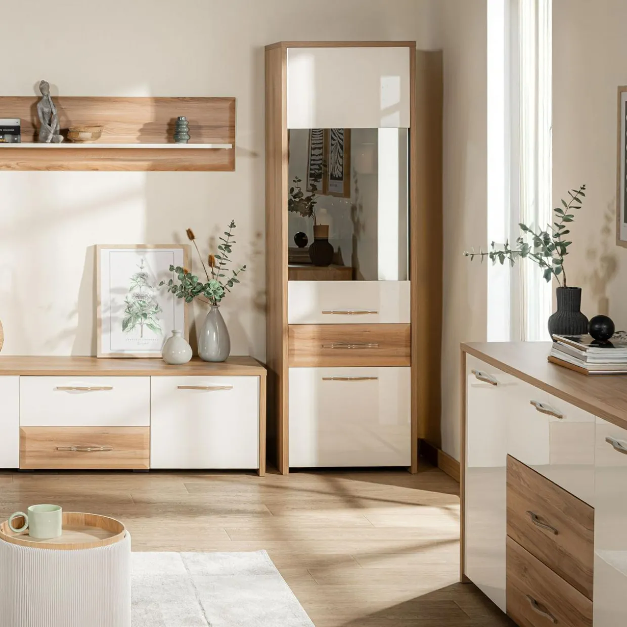 Witryna GALA to mebel, który wprowadzi nowoczesny styl do Twojego wnętrza. Połączenie dekoru drewna z beżowym wykończeniem na wysoki połysk nadaje jej wyjątkowego charakteru.