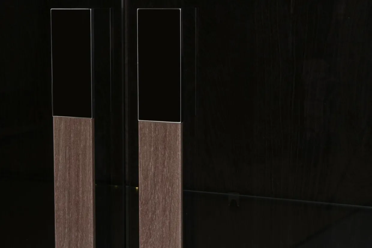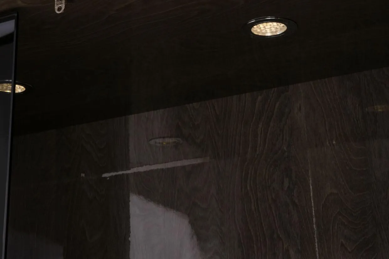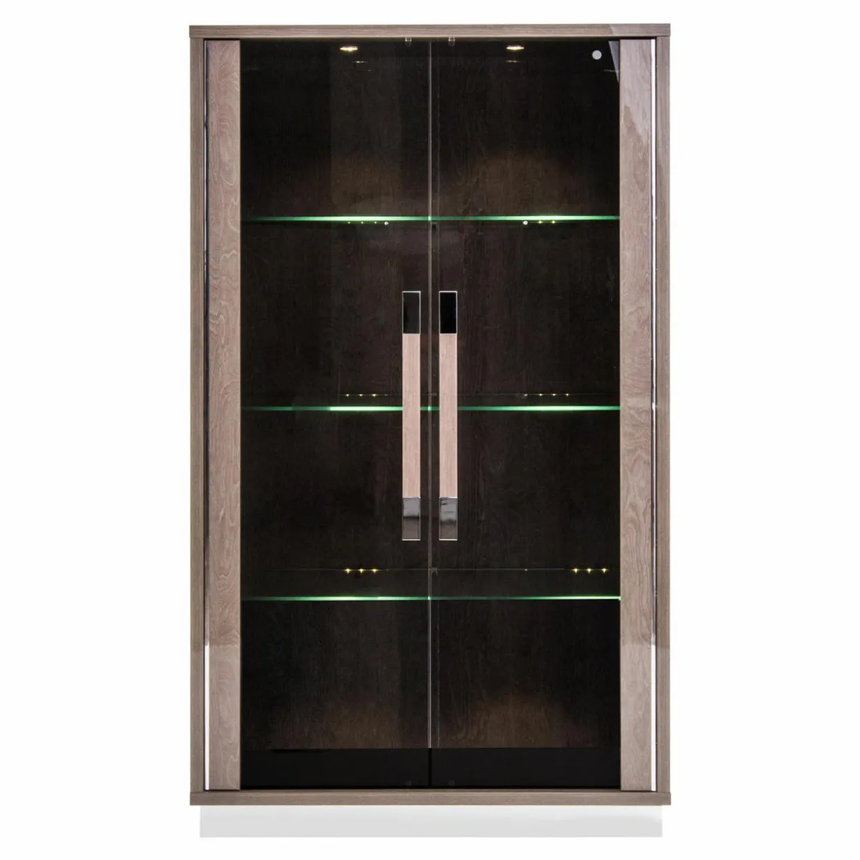 Płyta meblowa, z której zostały wykonane elementy witryny jest pokryta półbłyszczącą powłoką w kolorze srebrna brzoza.