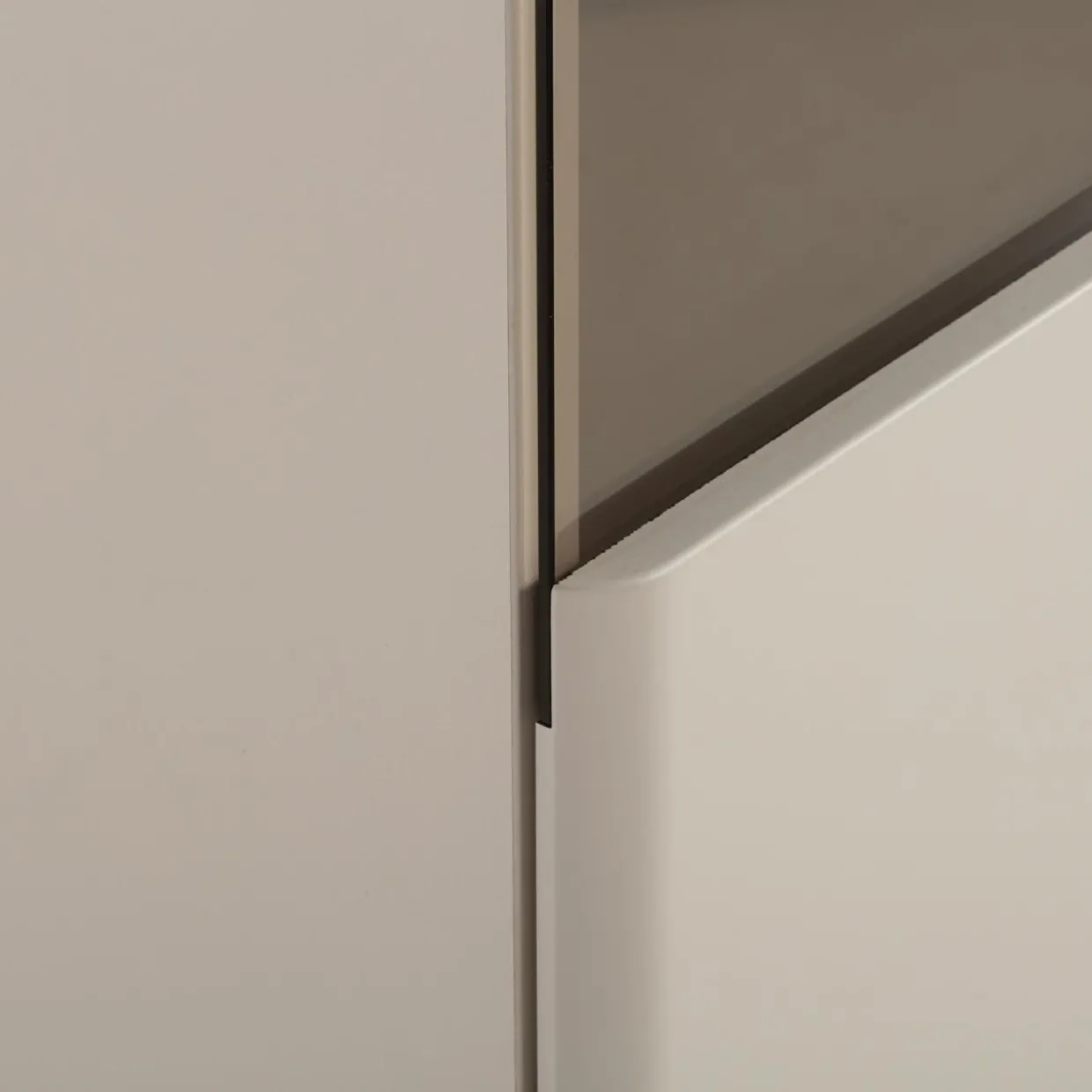 - Nietuzinkowe uchwyty z liściem pełnią rolę funkcjonalną, ale także stanowią ozdobę pomieszczenia. Ciemne, metalowe listki wyróżniają na tle frontów w odcieniach savany i kaszmiru.