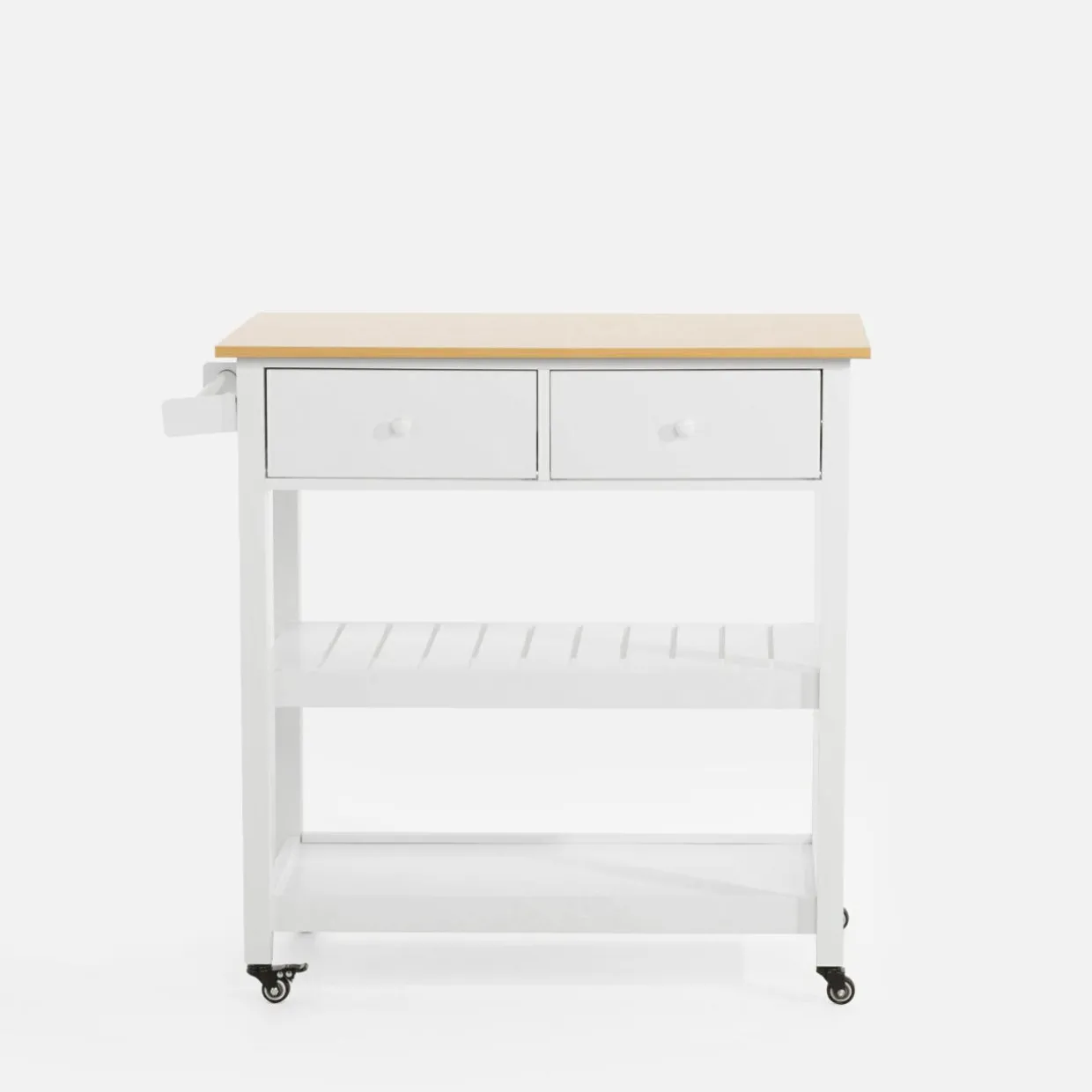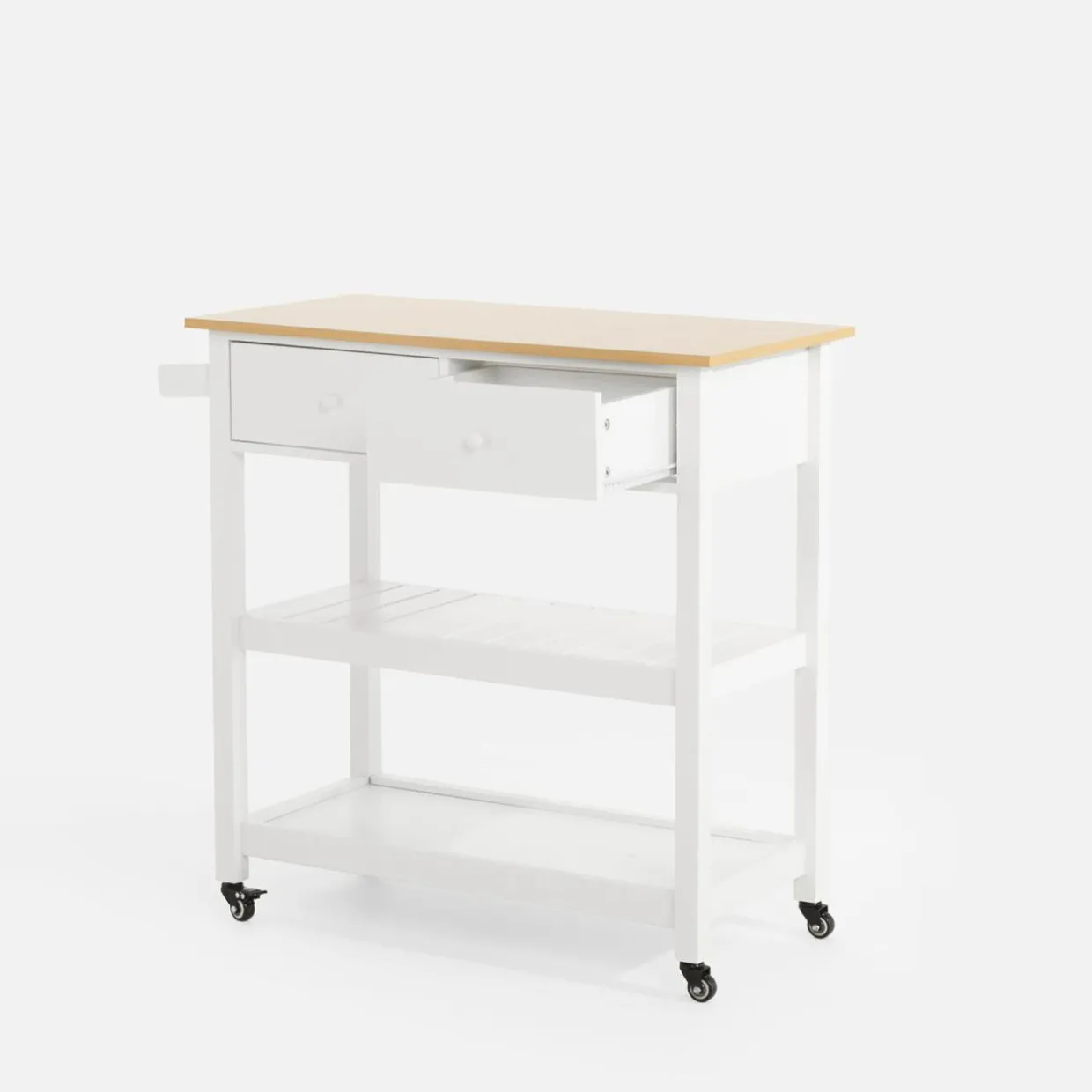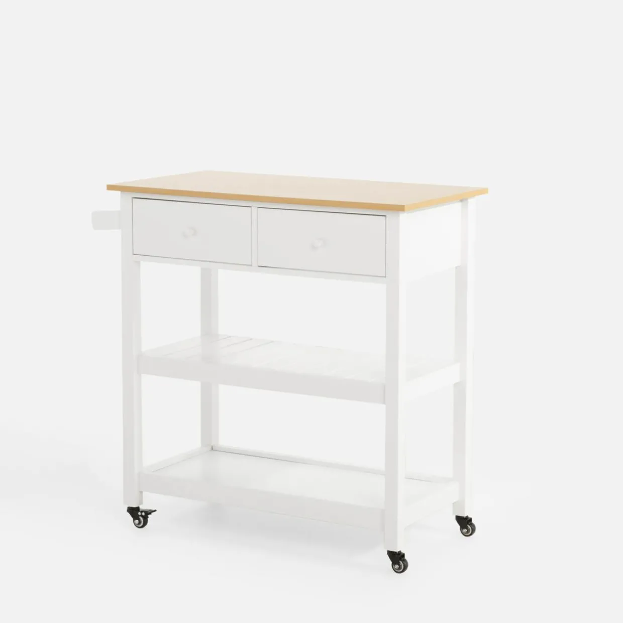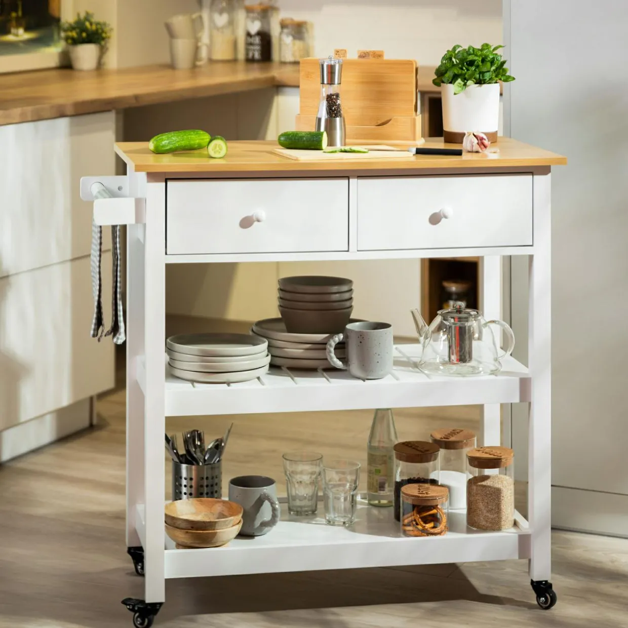 - Wózek posiada 4 kółka, w tym 2 z blokadą. Gdy podjedziesz z jedzeniem do salonu czy jadalni wystarczy, że zablokujesz kółka, stabilizując mebel.