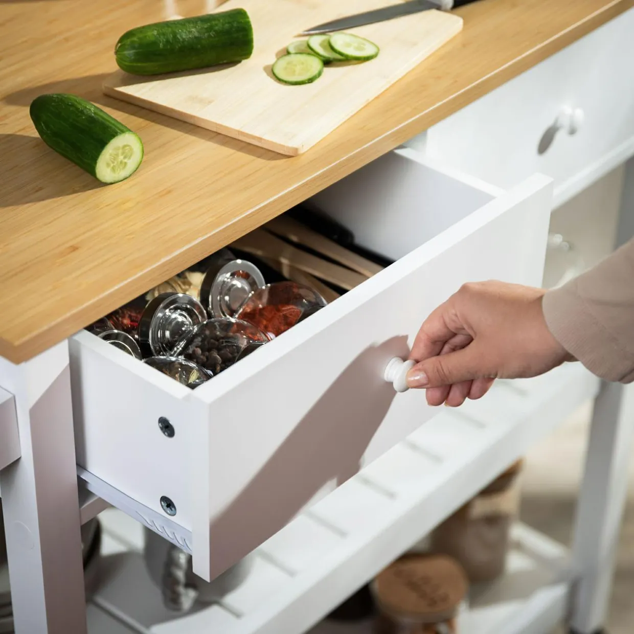 - W każdej szufladzie o maksymalnym obciążeniu 5 kg zmieścisz dodatki — sztućce, serwetki czy korkociąg.