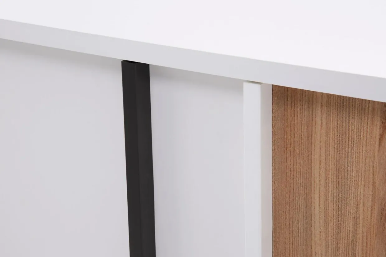 - Połączenie 3 kolorów to mieszanka koloru szarego przypominającego surowy beton, bieli oraz dębu.
