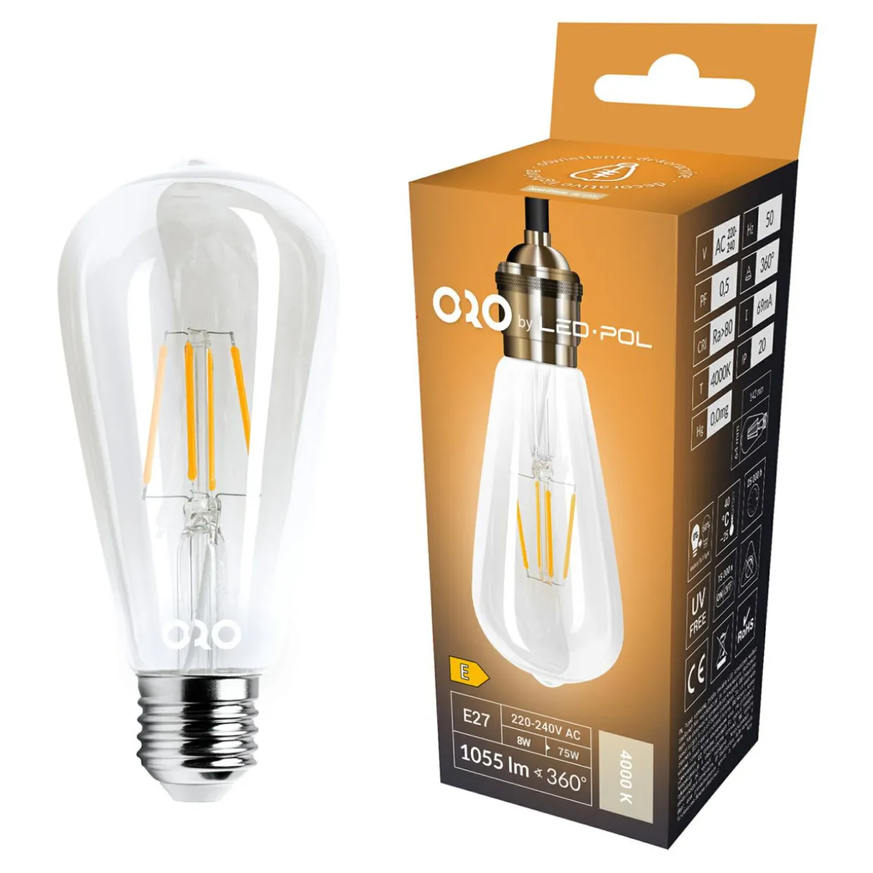 ORO-E27-ST64-FL-CLARO-8W-DW przeznaczona jest do pracy pod napięciem 230V.