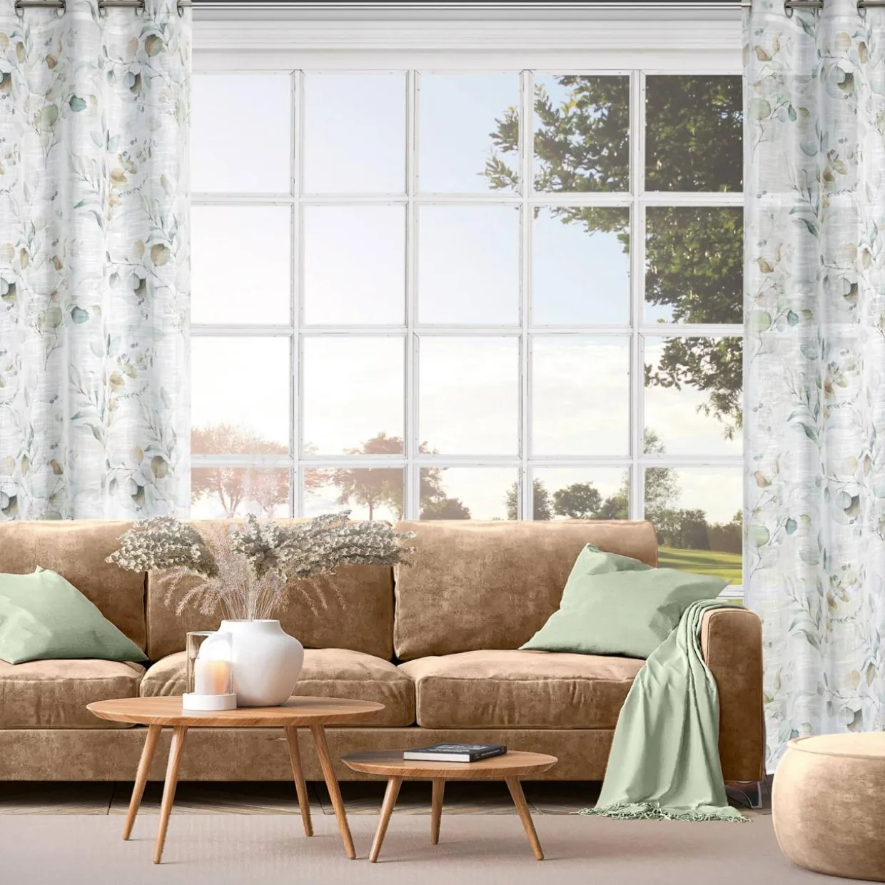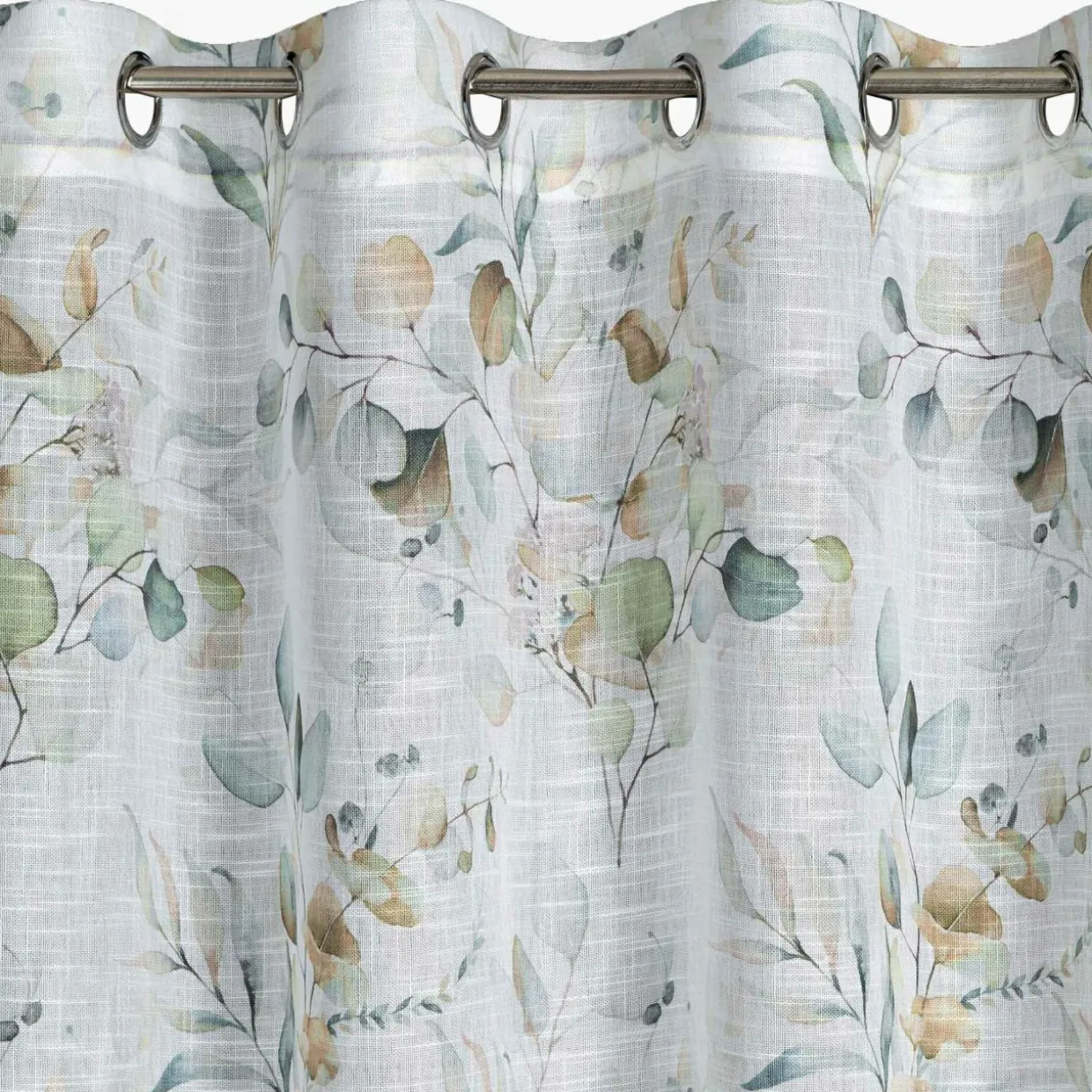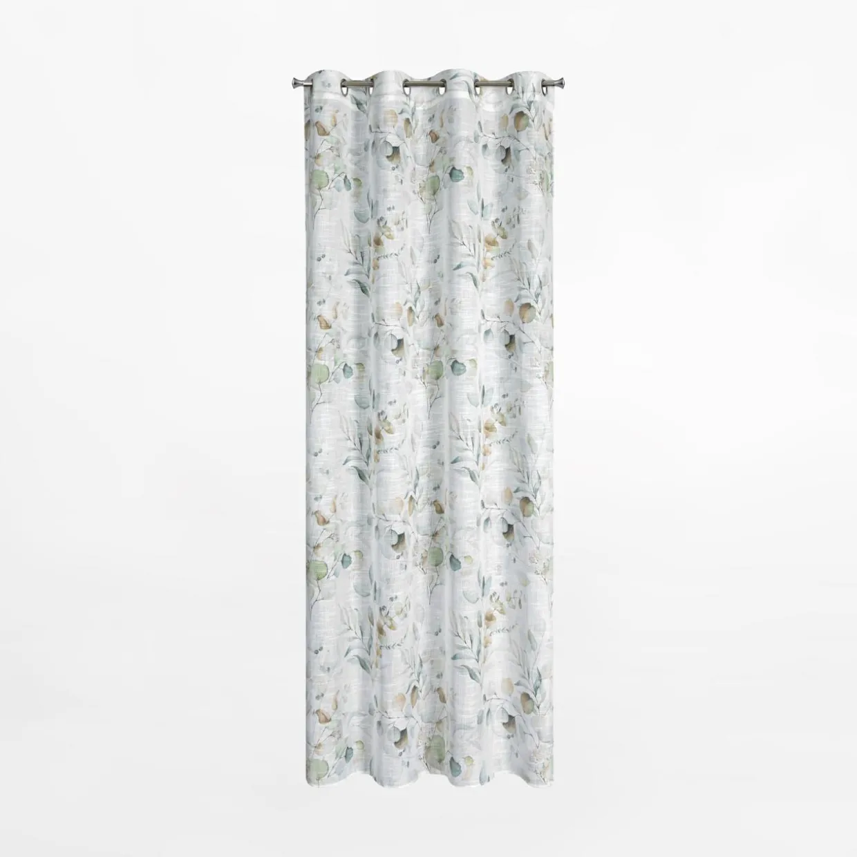 Biało-niebieska zasłona SENA z subtelnym roślinnym motywem, to przyjemny dodatek łączący naturę z nowoczesnością.