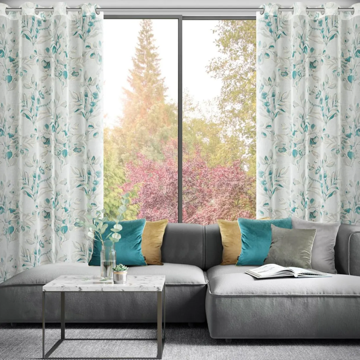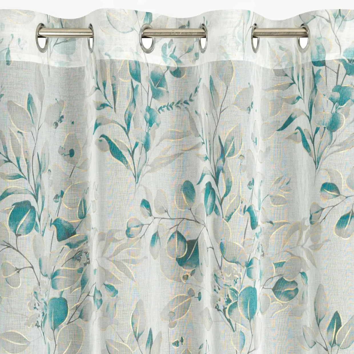 Zwiewna zasłona na przelotkach AVA z motywem liści muśniętych szampańskim złotem dopełni aranżację w stylu glamour.
