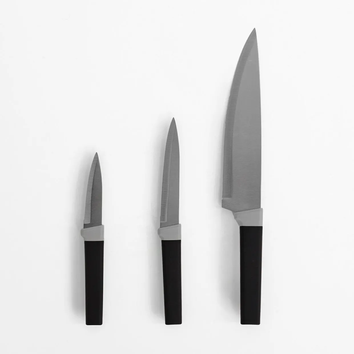 Praktyczny i wytrzymały zestaw 3 noży kuchennych, doskonale sprawdzi się w codziennym użytkowaniu. Każdy nóż został zaprojektowany z myślą o różnych potrzebach kulinarnych – od krojenia większych kawałków mięsa czy warzyw, po precyzyjne obieranie i siekanie. Noże wykonane są ze stali nierdzewnej, zapewniającej doskonałą ostrość, a ergonomiczne rękojeści z powłoką TPR gwarantują wygodę i pewny uchwyt.