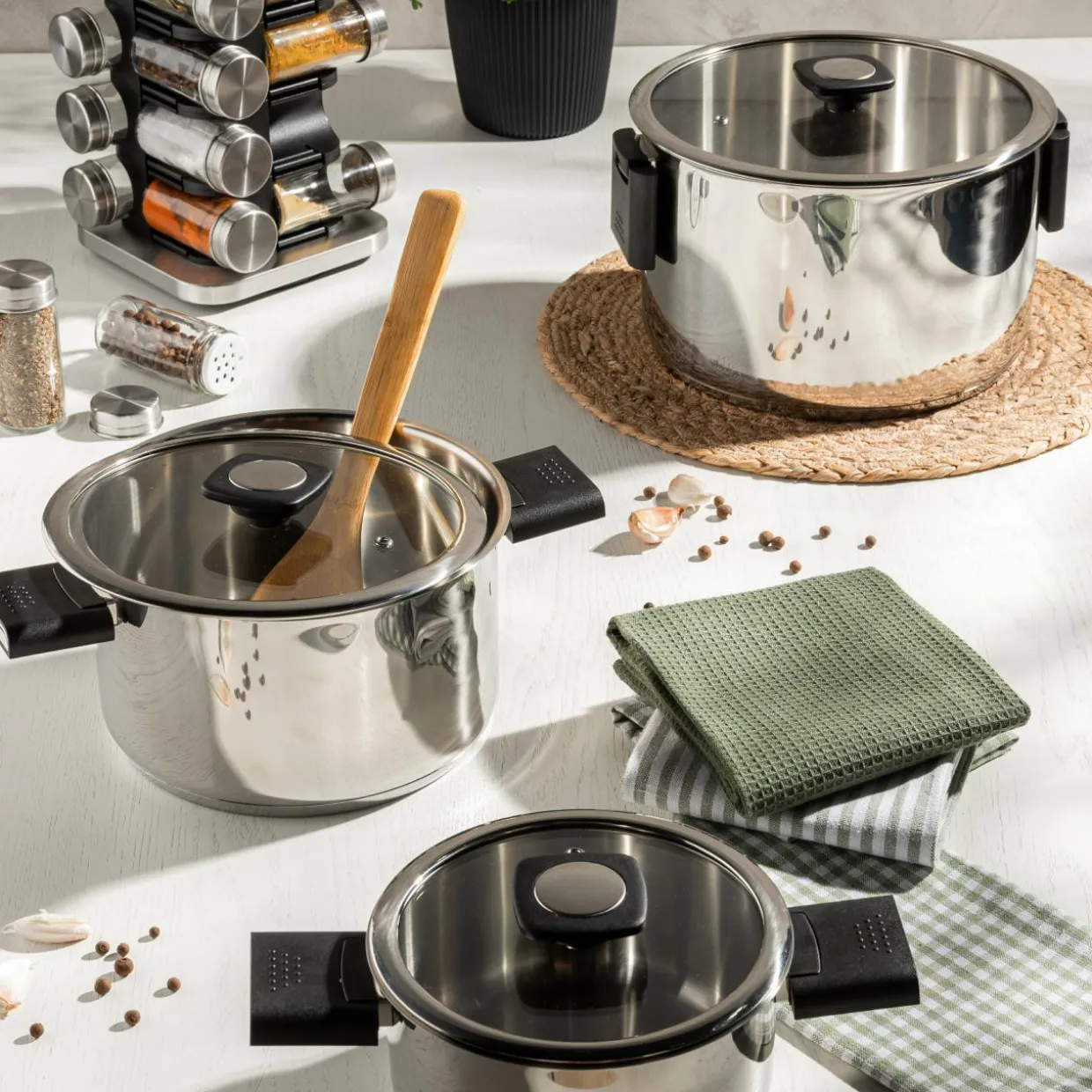 Składane uchwyty pozwalają włożyć mniejsze garnki w większy rozmiar – trzymasz jeden komplet w jednym miejscu.