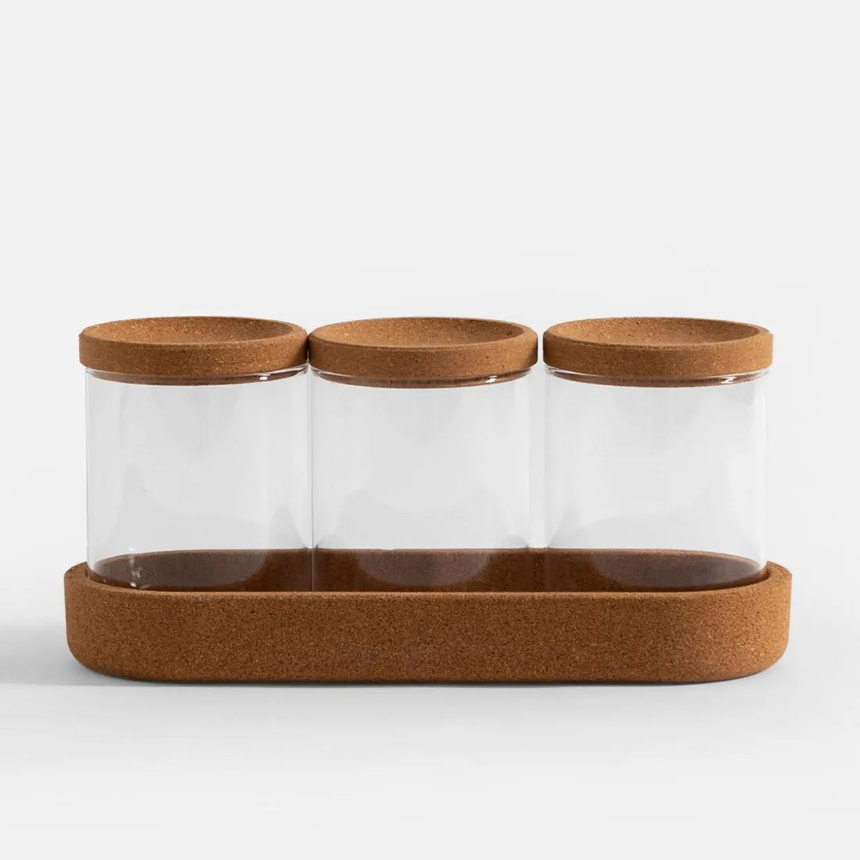 Zestaw 3 szklanych pojemników na korkowej podstawie
