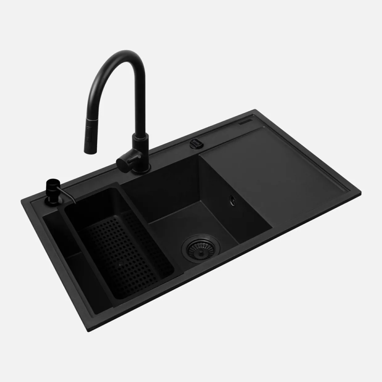 - Czarne, matowe wykończenie tworzy ze zlewozmywakiem spójny, elegancki zestaw.
