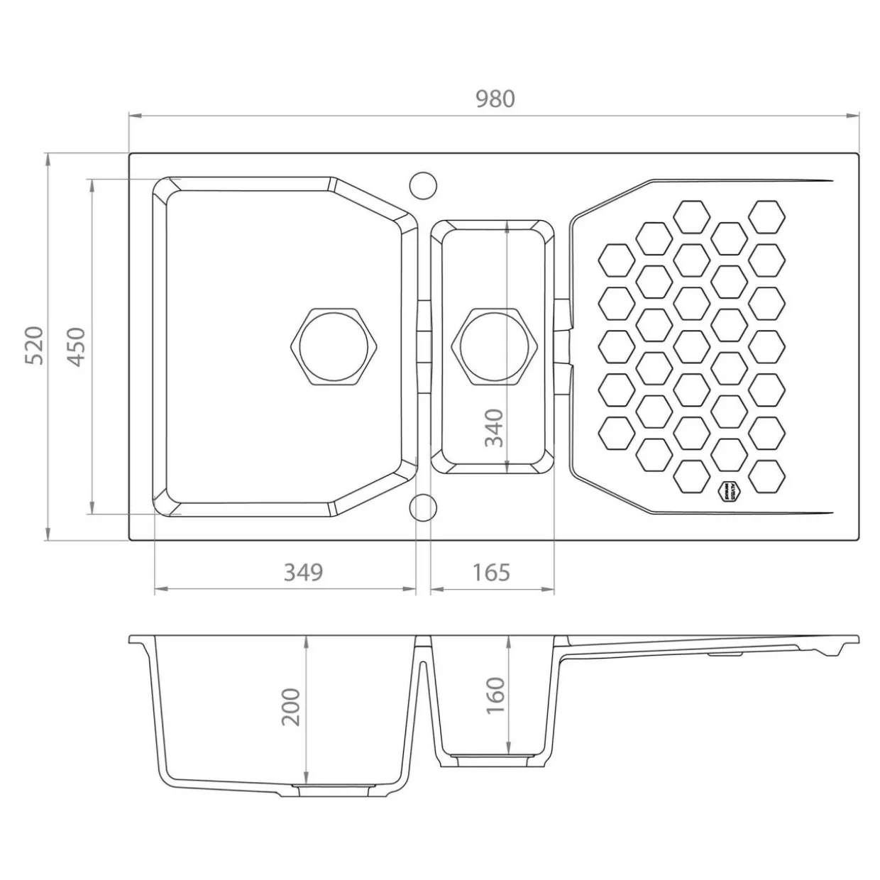 Posiada fabrycznie wykonane otwory ø35 mm na baterię i korek typu POP-UP. Do zlewozmywaka jest również dołączony syfon. Odpływ – Ø 114.