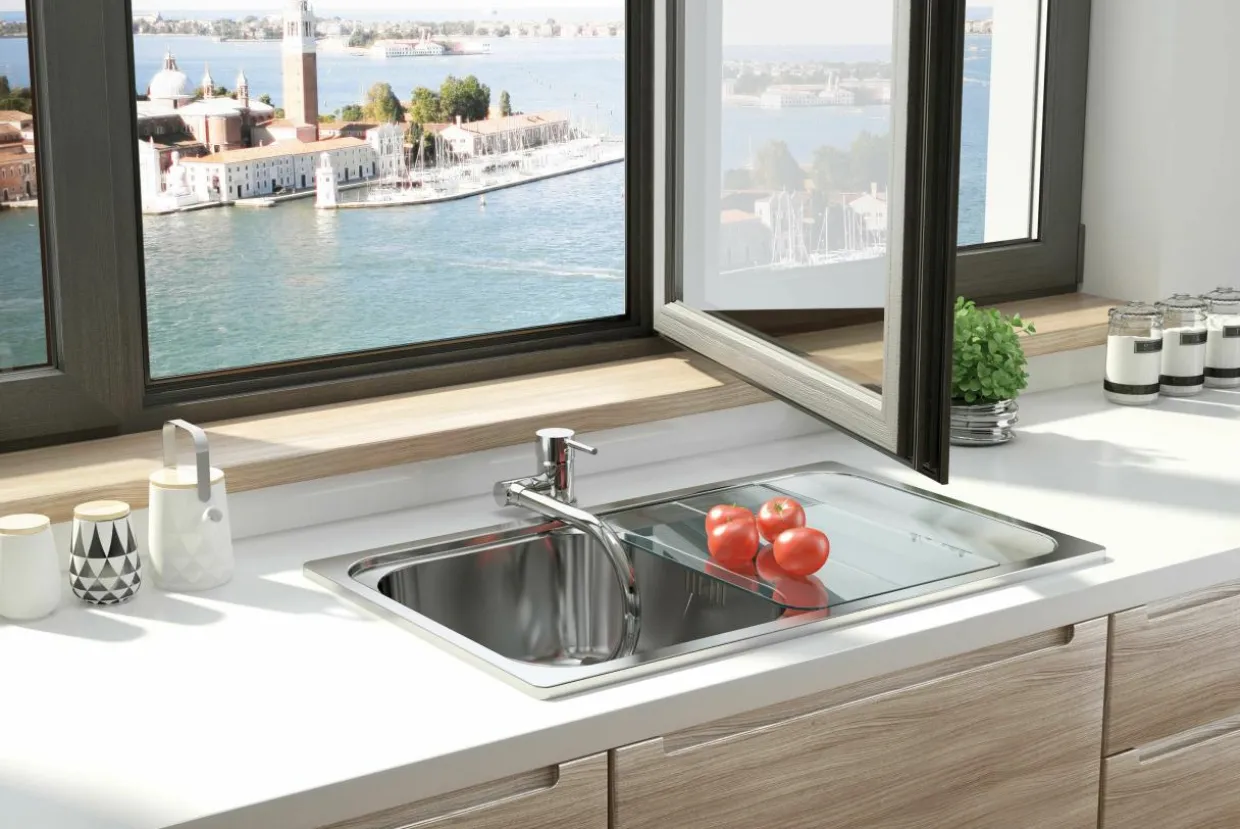 Wykonana ze stali szlachetnej posiada eleganckie chromowane wykończenie, które można z powodzeniem zestawić z jasną kolorystyką kuchni.