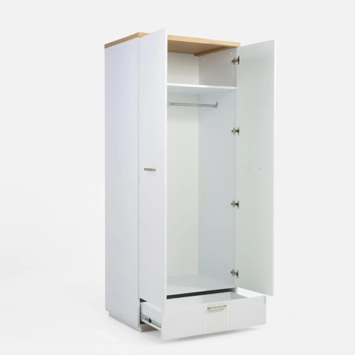 - W dolnej części szafy znajdziesz szufladę, bo dodatkowego miejsca na pościel czy bieliznę nigdy dosyć!
