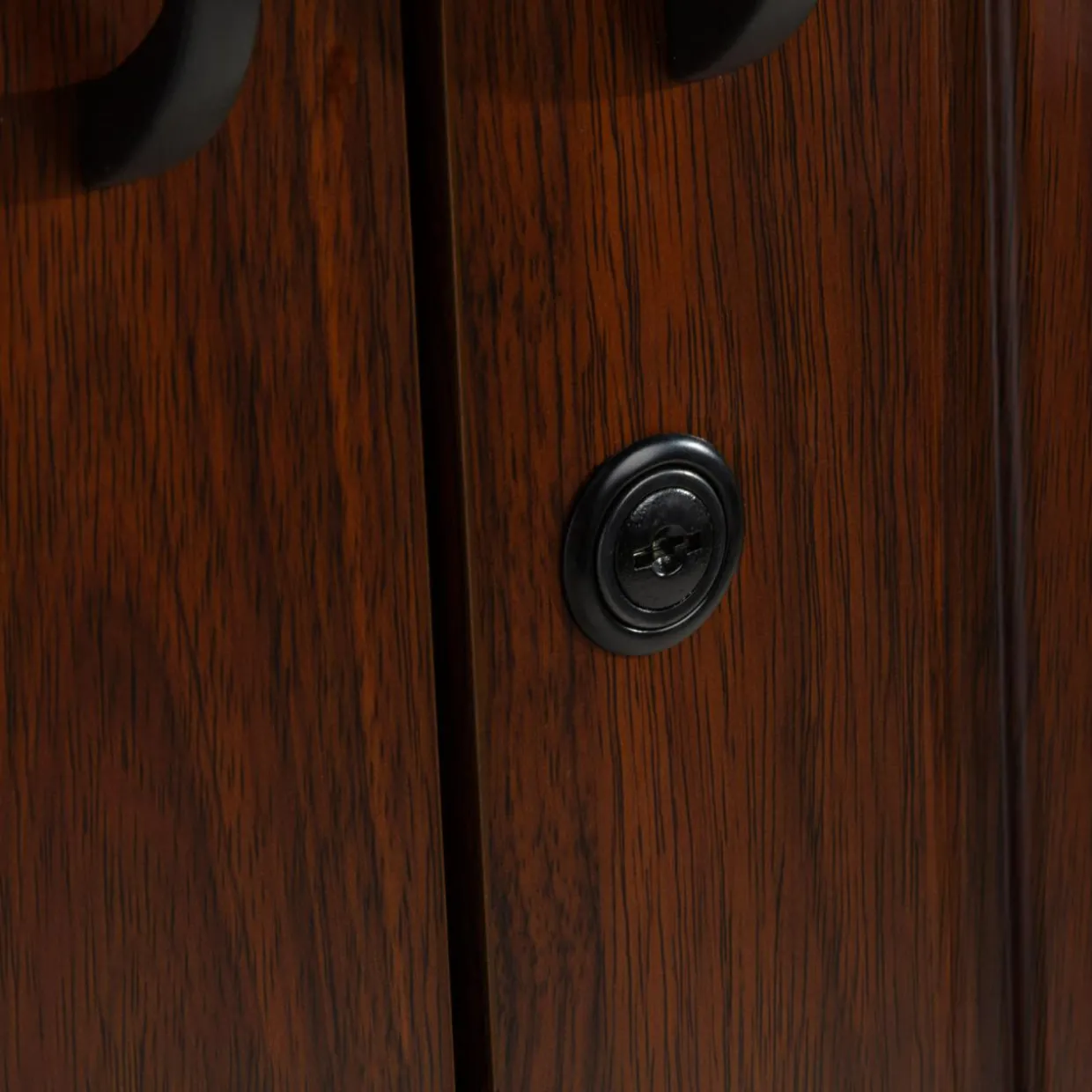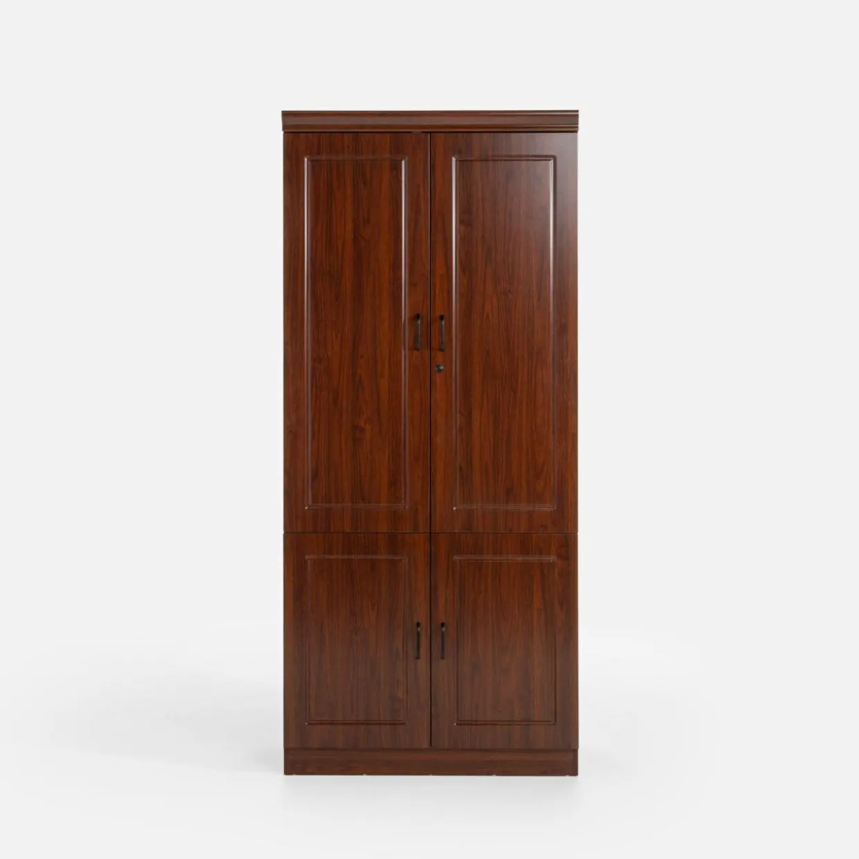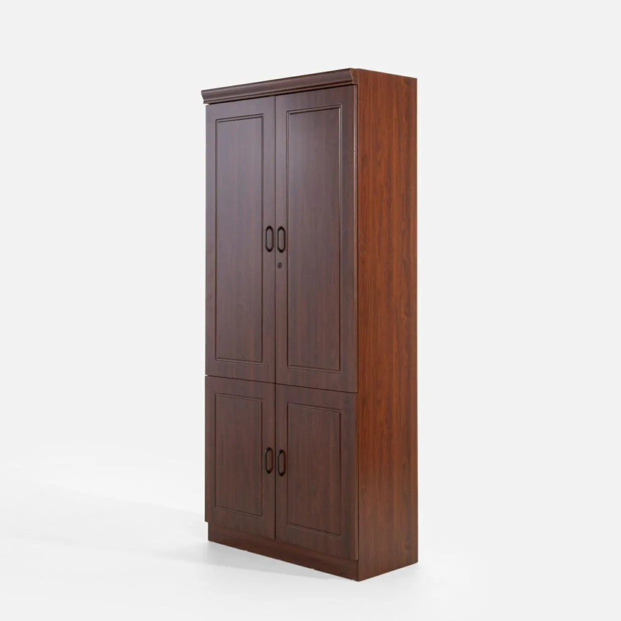 Wykończenie mebli w kolorze czerwonego orzecha prezentuje się elegancko – dzięki ciemnemu odcieniu imitacji drewna kolekcja stworzy profesjonalną i przyjazną atmosferę, idealną do prowadzenia spotkań biznesowych i konferencji. Proste linie mebli i minimalistyczne uchwyty podkreślają ich funkcjonalność.