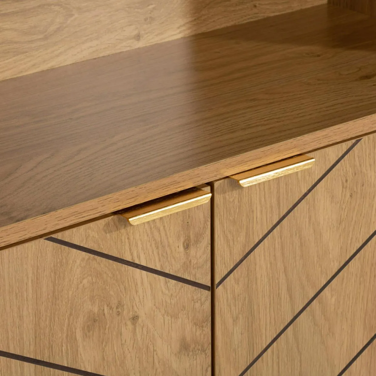 - Uchwyty i nogi w barwach podobnych do mebli dodatkowo podkreślają ciepły kolor wykończenia.