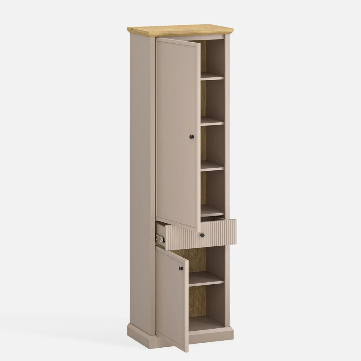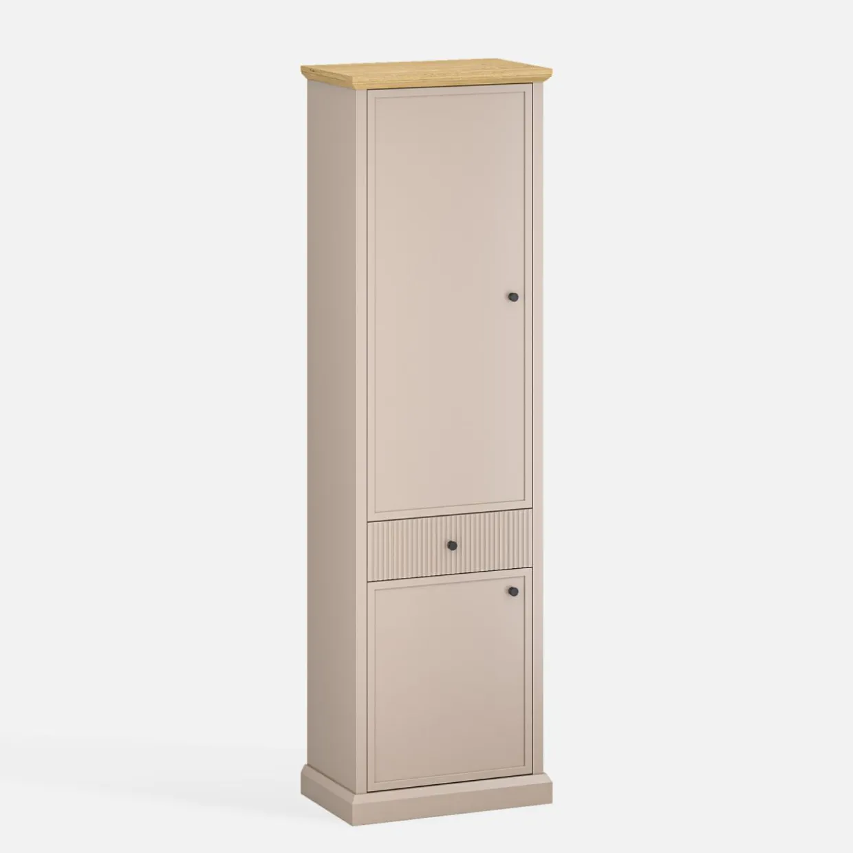 Bieliźniarka IDELLO to praktyczny mebel zaprojektowany z myślą o maksymalnym wykorzystaniu przestrzeni w domu. Jej pionowa konstrukcja sprawia, że świetnie sprawdzi się w ustawieniu w narożniku lub w szeregu z innymi meblami, np. komodą.
