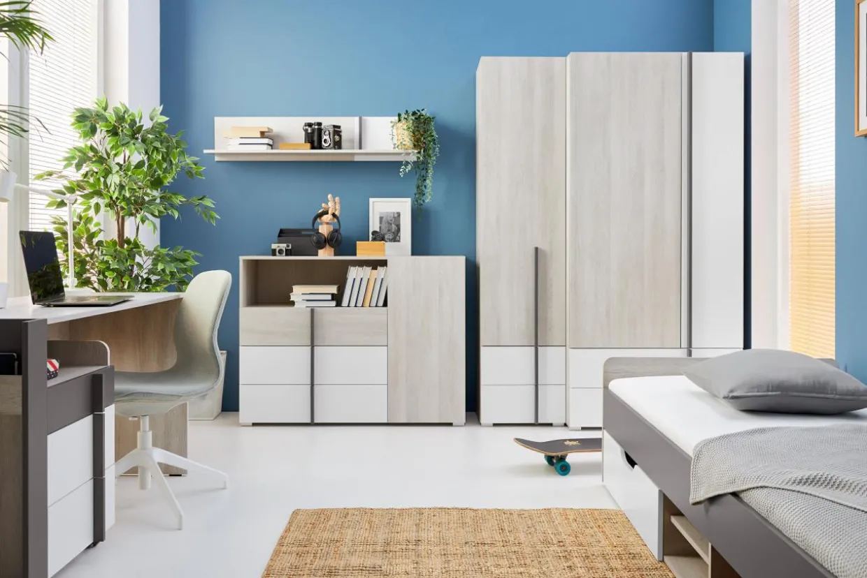Połączenie kolorów białego dębu wilton z matową bielą i modną szarością zachęca do wstawienia bieliźniarki REMO do jasnego pokoju nastolatka.