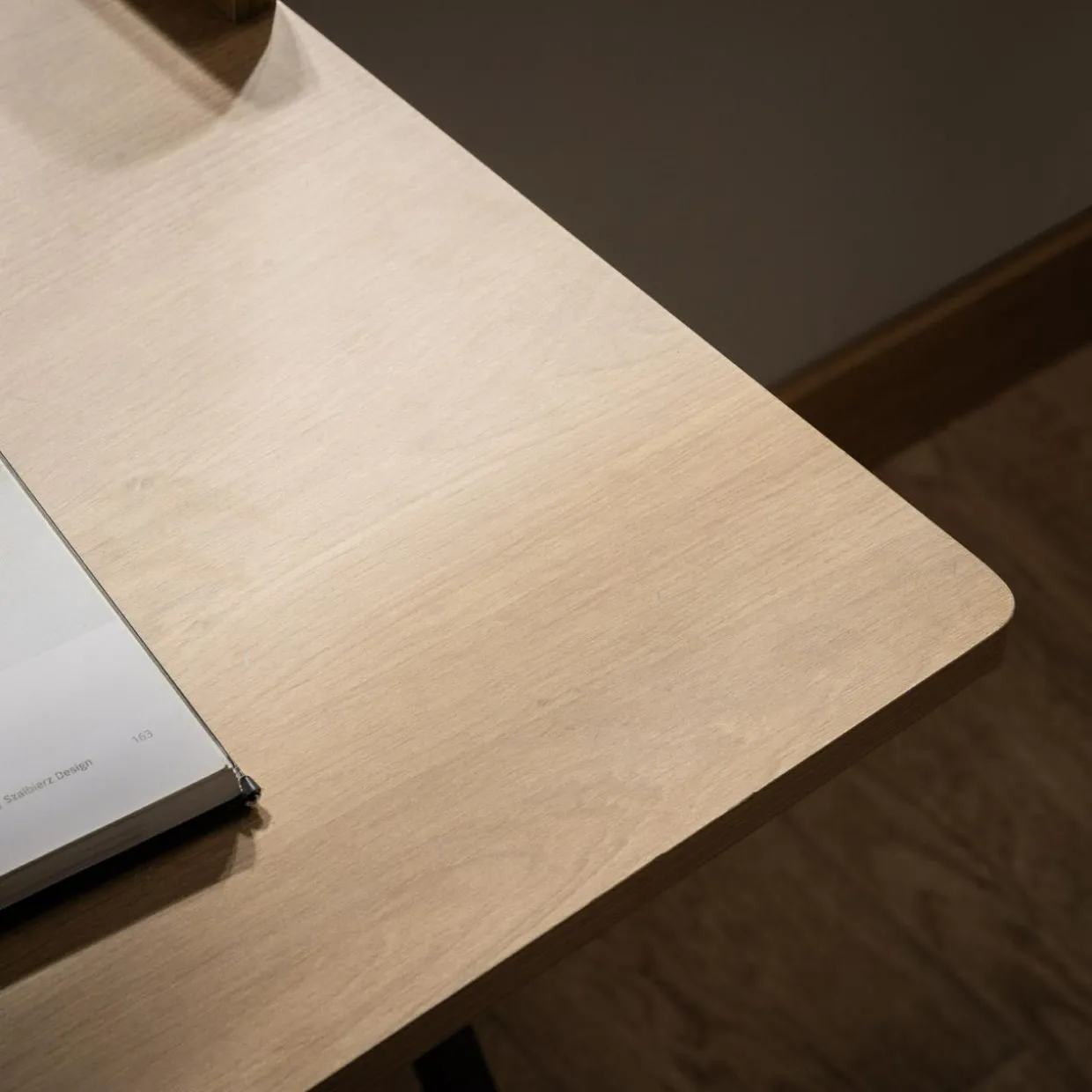 Biurko wykończone jest okleiną drewnopodobną. Rysunek sęków i słojów przypominają naturalne drewno.