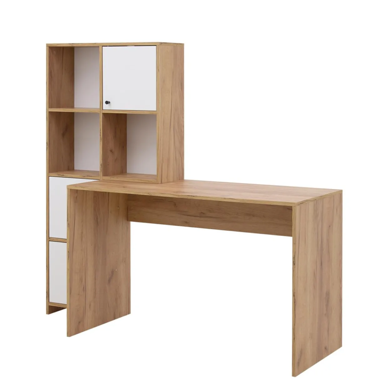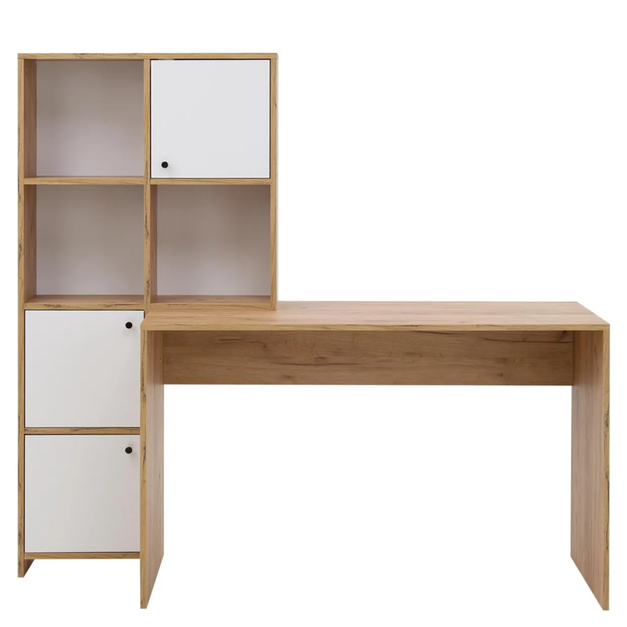 Do biurka dołączony jest regał z otwartymi i zamykanymi półkami . To rozwiązanie pomaga utrzymać porządek podczas nauki.