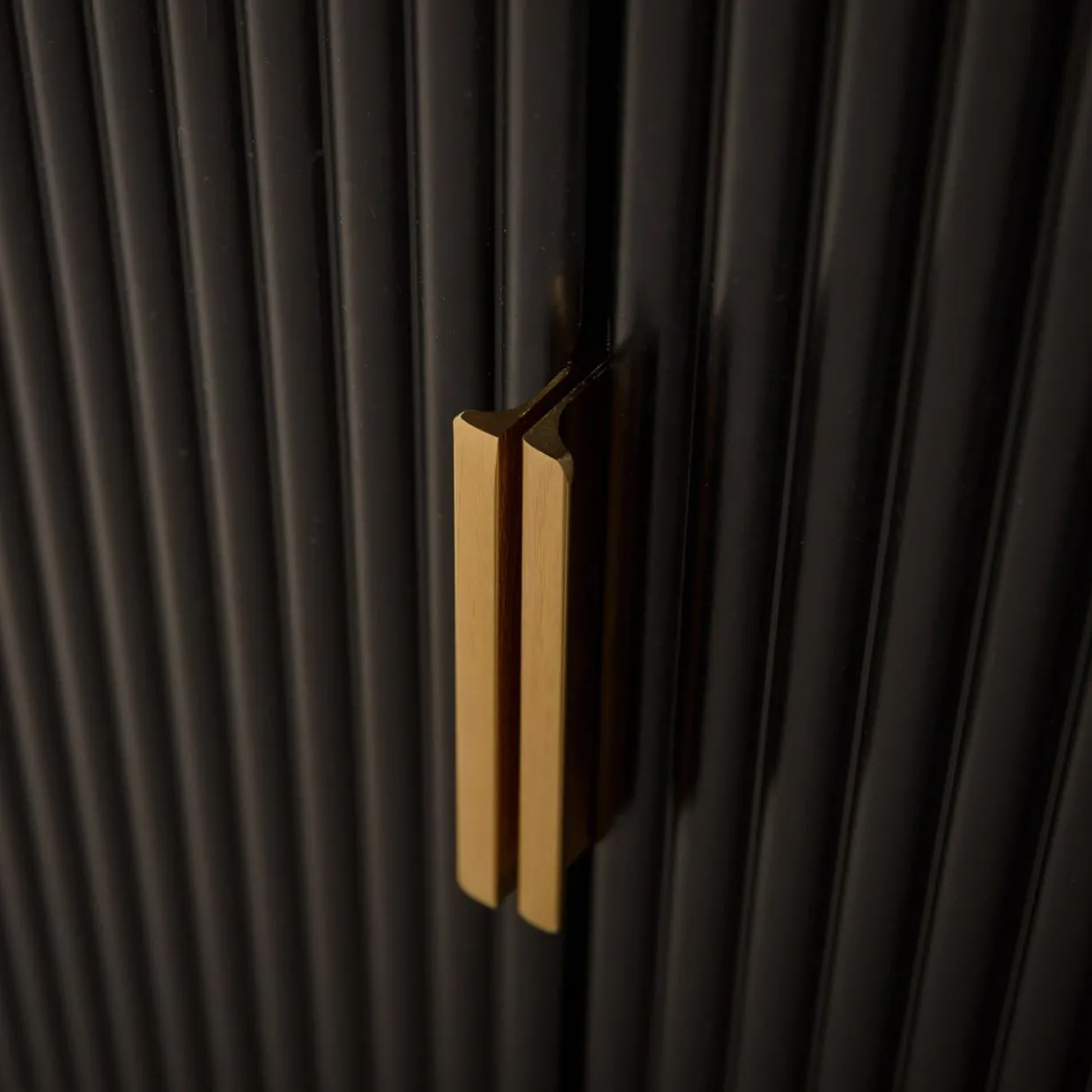 - Złote uchwyty dopełniają czarne geometryczne bryły mebli.