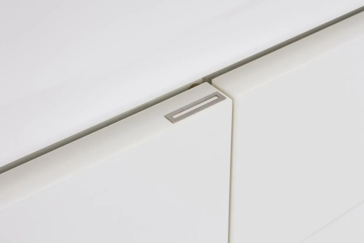 Biała, budząca skojarzenia z luksusem barwa pokrywająca bufet, harmonizuje błyszczącymi elementami w barwie chromu. Wysoki połysk lakieru to cecha charakterystyczna aktualnej, meblarskiej mody. Lśniąca, srebrzysta podstawa podkreśla elegancję i luksusowy charakter bufetu. Niejednolita powierzchnia frontowej części również decyduje o ciekawym efekcie końcowym.