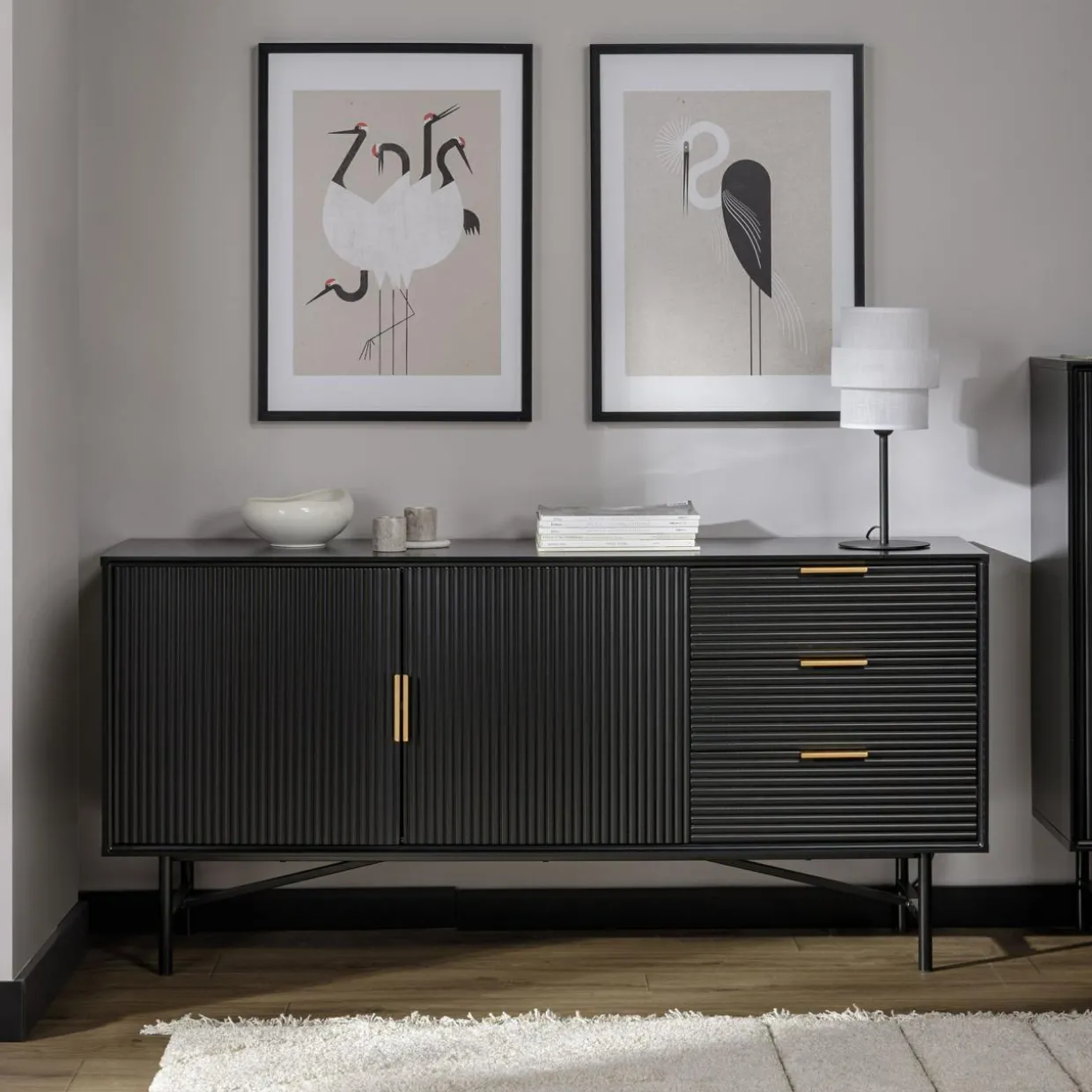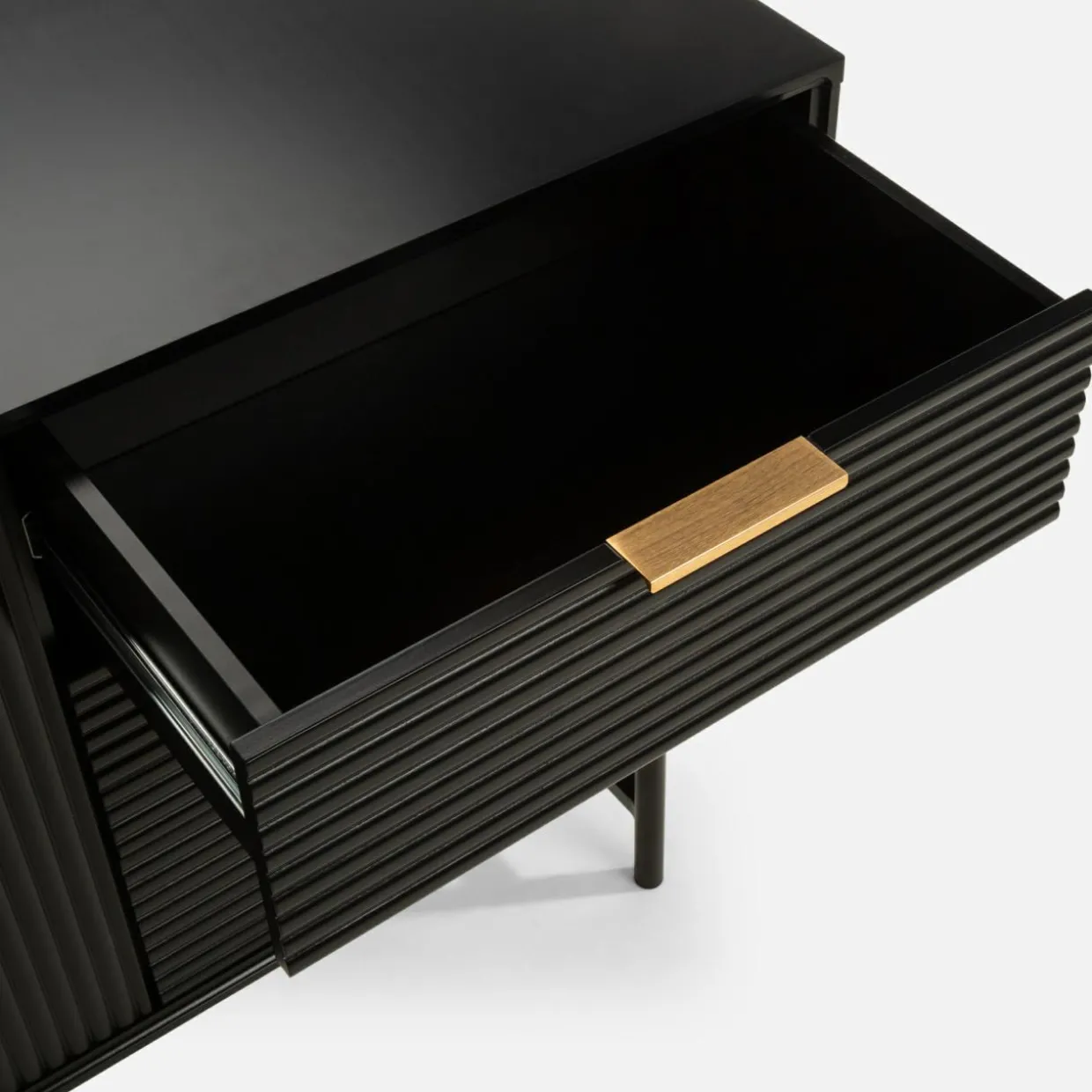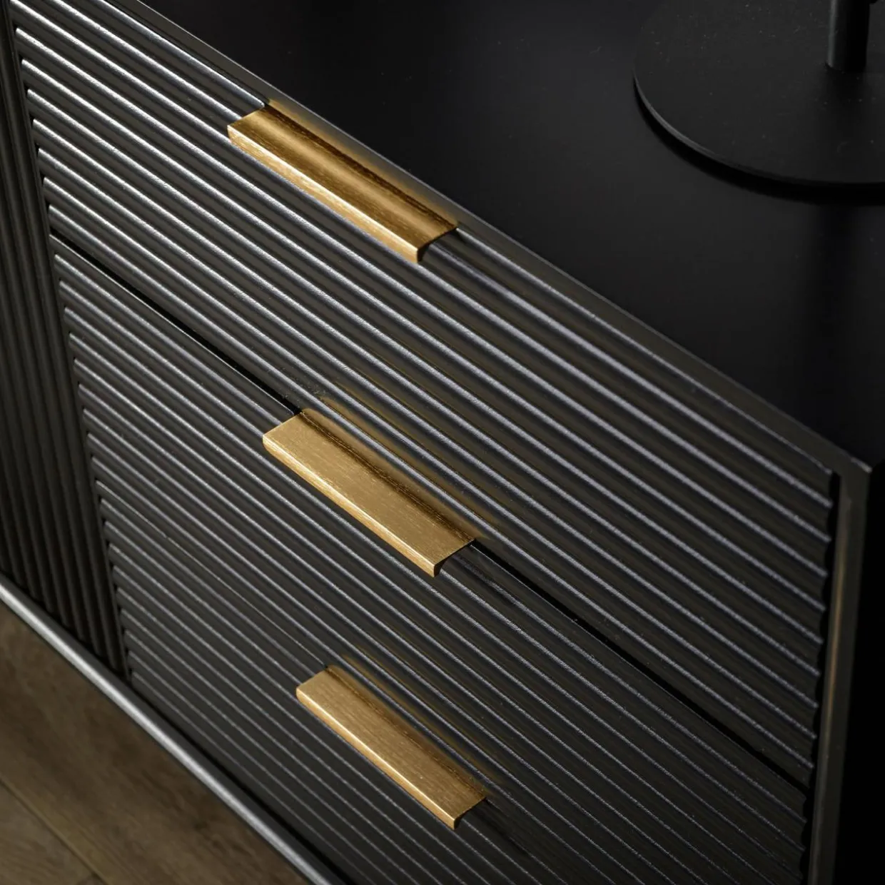 - Złote uchwyty dopełniają czarne geometryczne bryły mebli.