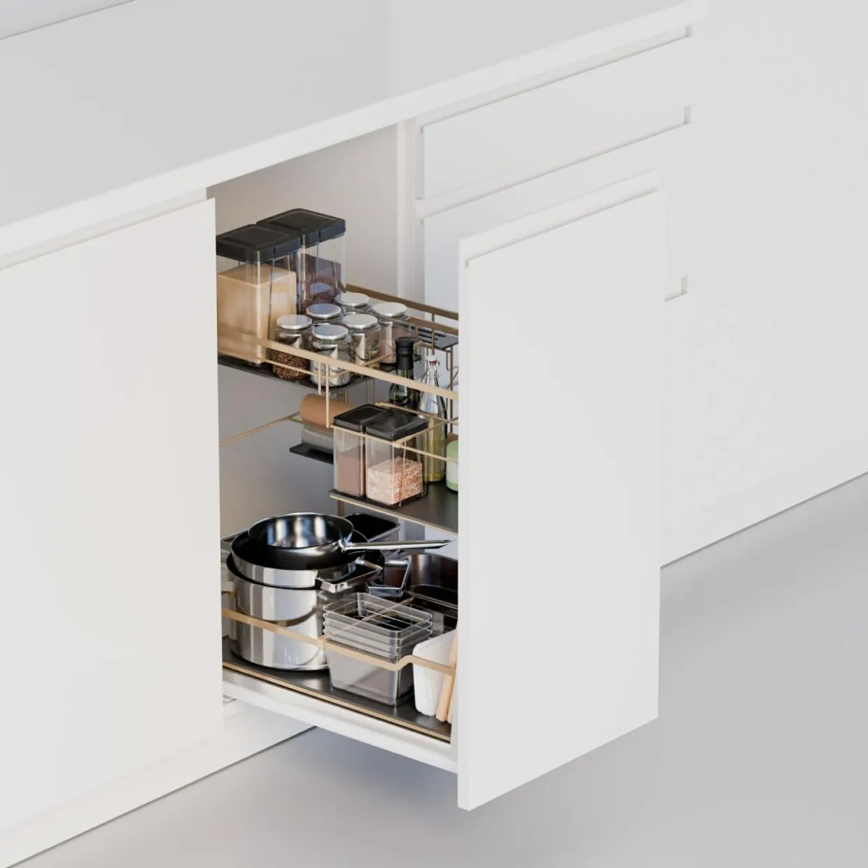 - W szafce wyposażonej w wysuwane kosze umieścisz produkty żywnościowe, przyprawniki lub wysokie butelki.