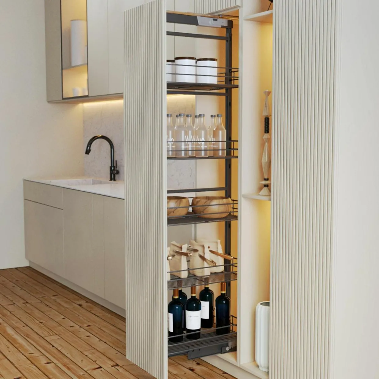 Wysuwane, pionowe szuflady, ruchome koszyki, czy półki montowane w szafkach narożnych to elementy, które pozwalają w intuicyjny sposób wykorzystać przestrzeń i skutecznie nią zarządzać.