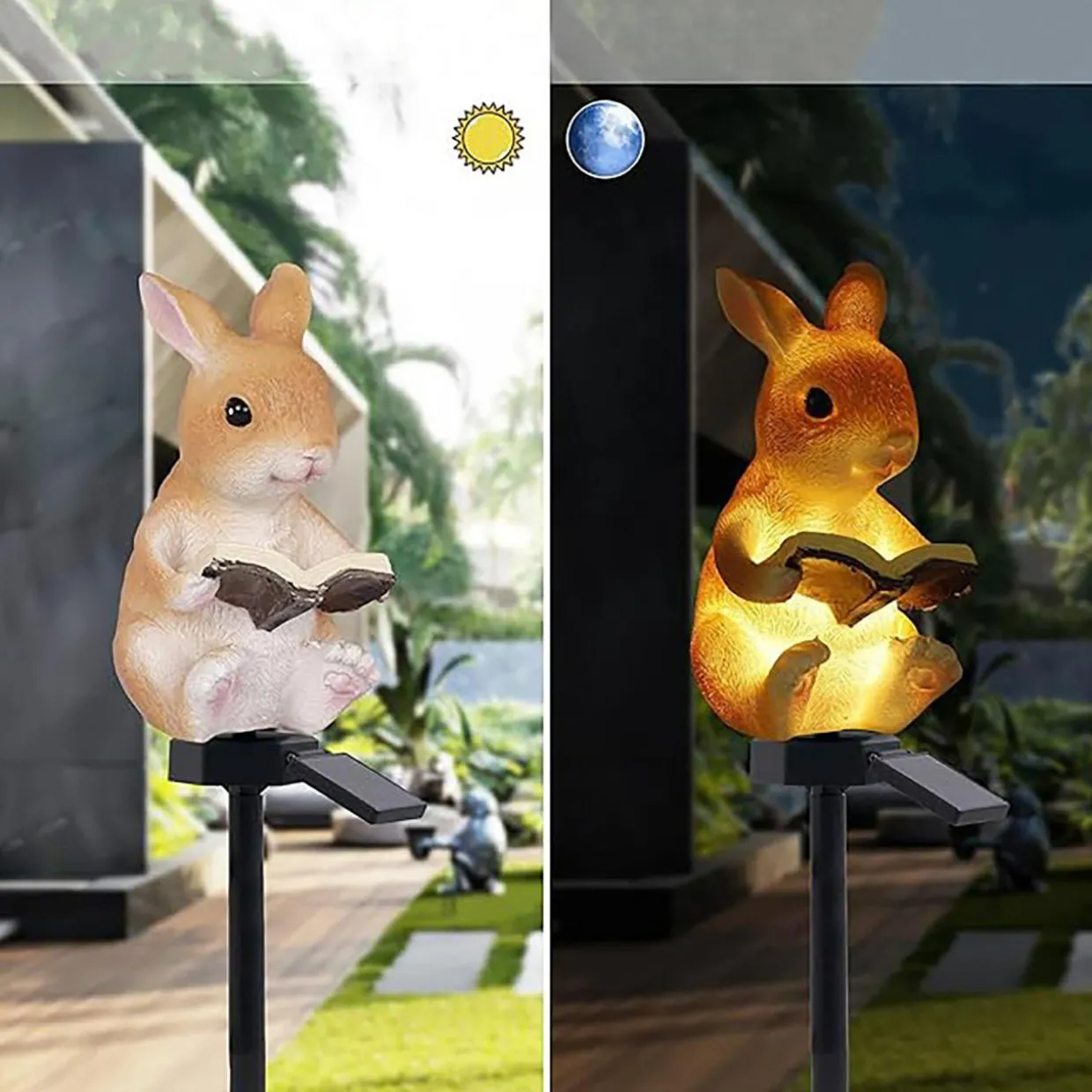 Figurka królika została wykonana z tworzywa i żywicy oraz umieszczona na postumencie z panelem solarnym.