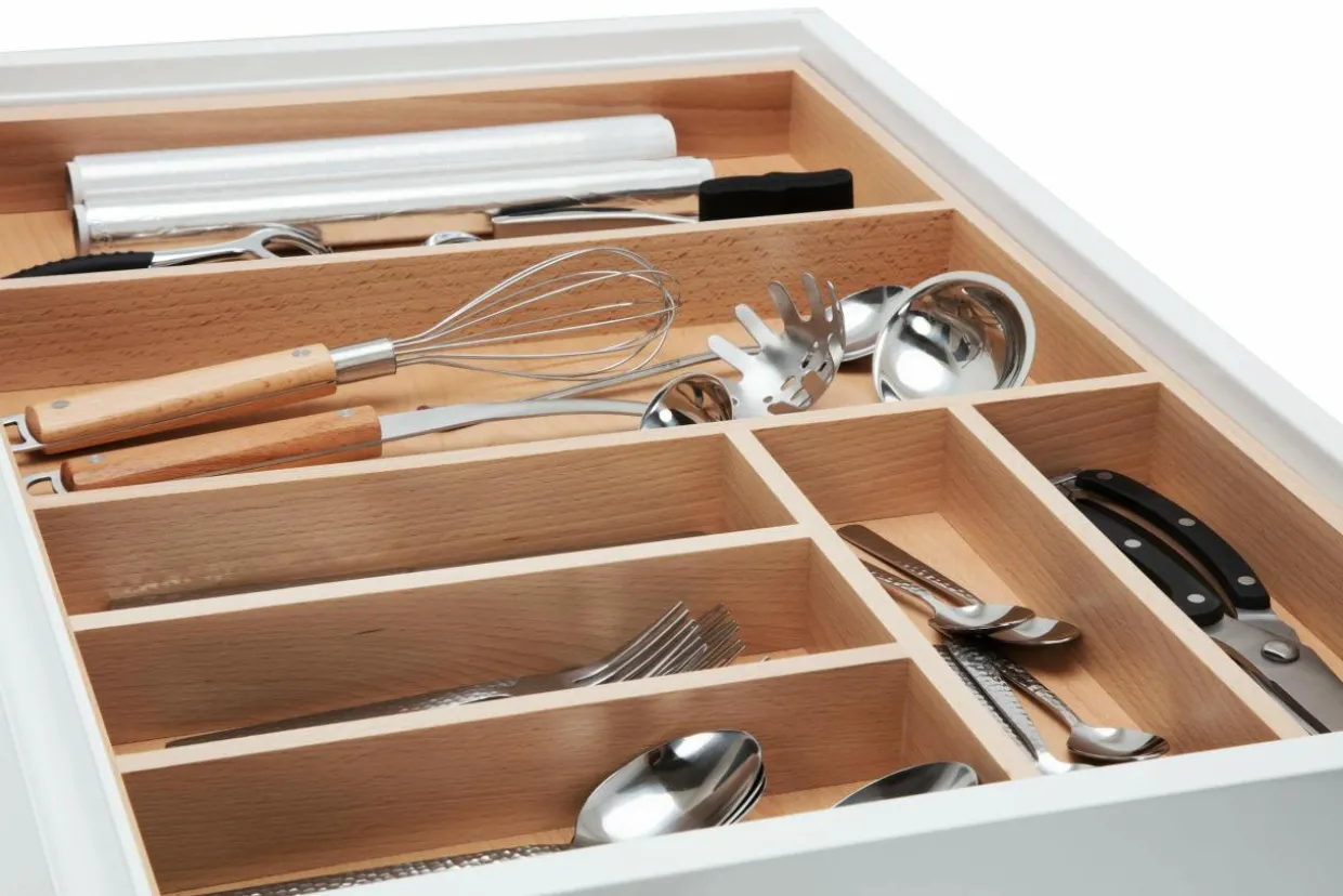 Idealnie komponuje się z linią szuflad, pozwala w przejrzysty sposób zorganizować sztućce. Dzięki dopasowanym przegródkom widelce, noże łyżki i łyżeczki można ładnie ułożyć i przygotować do użycia.