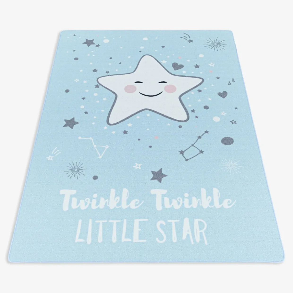 Twoje dziecko marzy o tym, aby przenieść się do bajkowego świata? Teraz to możliwe. Zdecyduj się na zakup niebieskiego dywanu PLAY z motywem uśmiechniętej gwiazdki. Uroczy napis „Twinkle twinkle little star” odwołuje się do słów kołysanki, która w polskiej wersji językowej brzmi: „Mrugaj, mrugaj gwiazdko ma…„