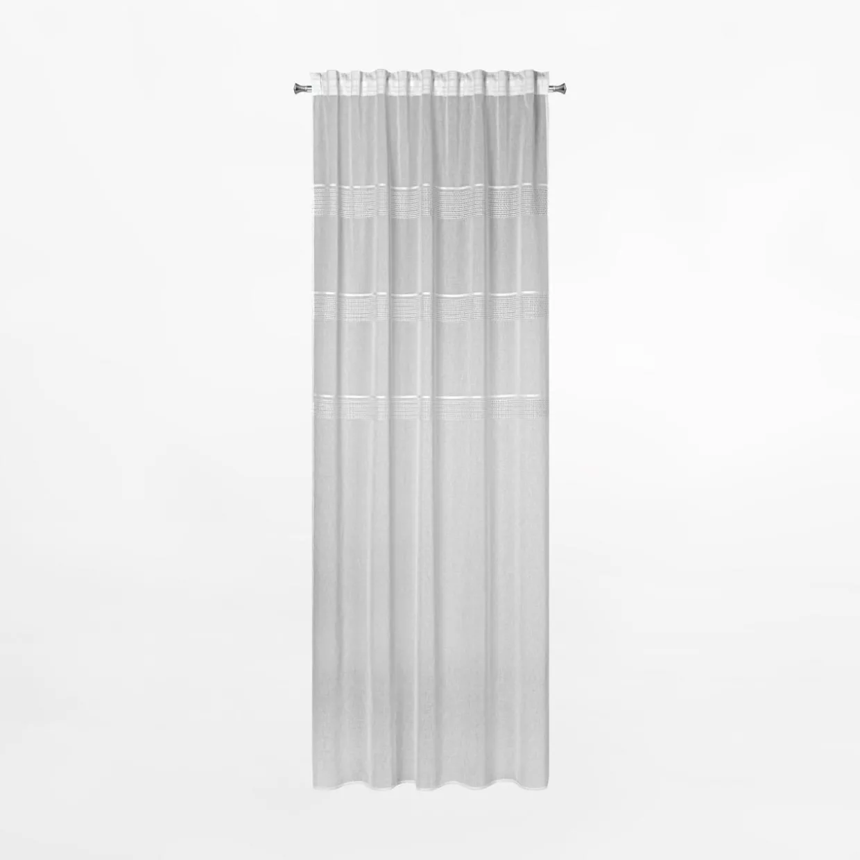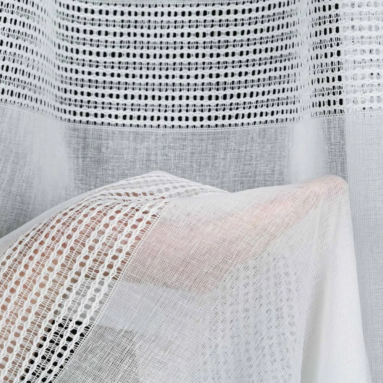 Biała firana jest uszyta z poliestru. Ma podwyższoną odporność na ścieranie oraz zagniecenia.