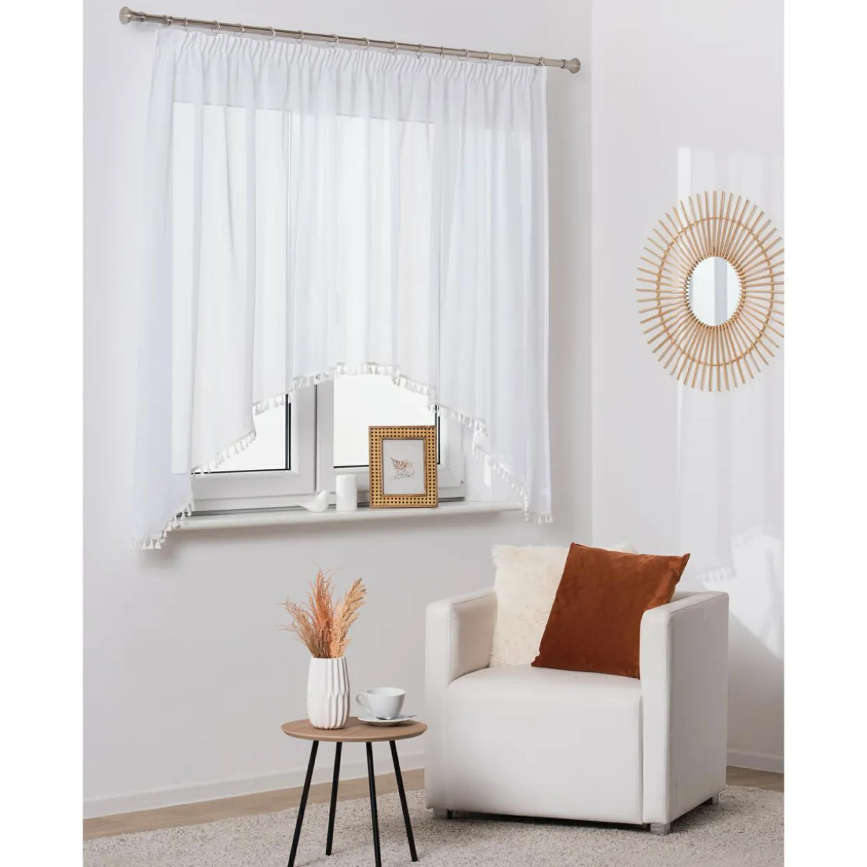 - Dół firany jest zwieńczony ozdobnymi frędzelkami, które sprawią, że podkreśli ona wnętrza w stylu boho.