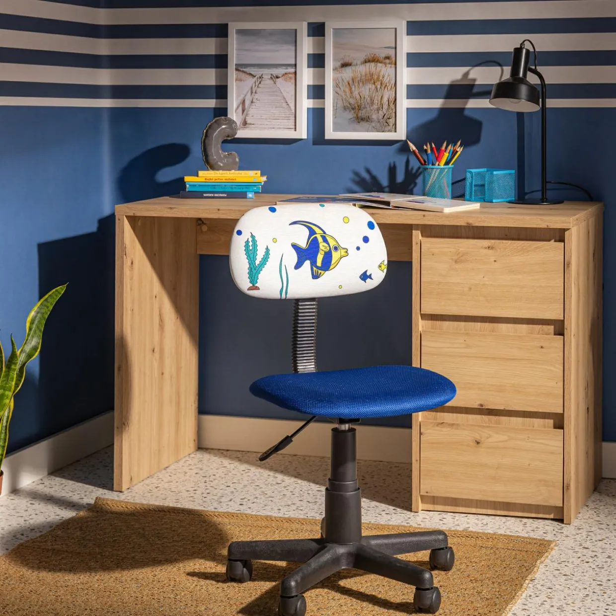 Szukasz bajkowego krzesła dla dziecka? Fotel biurowy BLUEMARINE świetnie sprawdzi się jako pierwszy fotel dla młodego ucznia. Bajkowy motyw rybek przeniesie Twoje dziecko w świat morskich głębin, co umili mu zabawę i odrabiane pracy domowej.