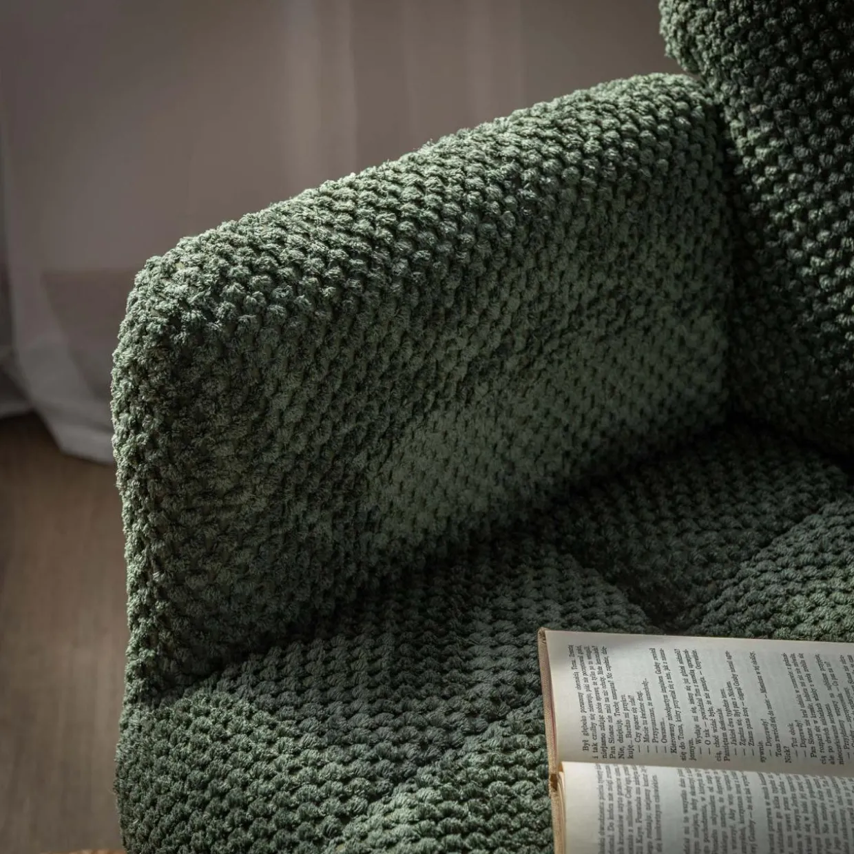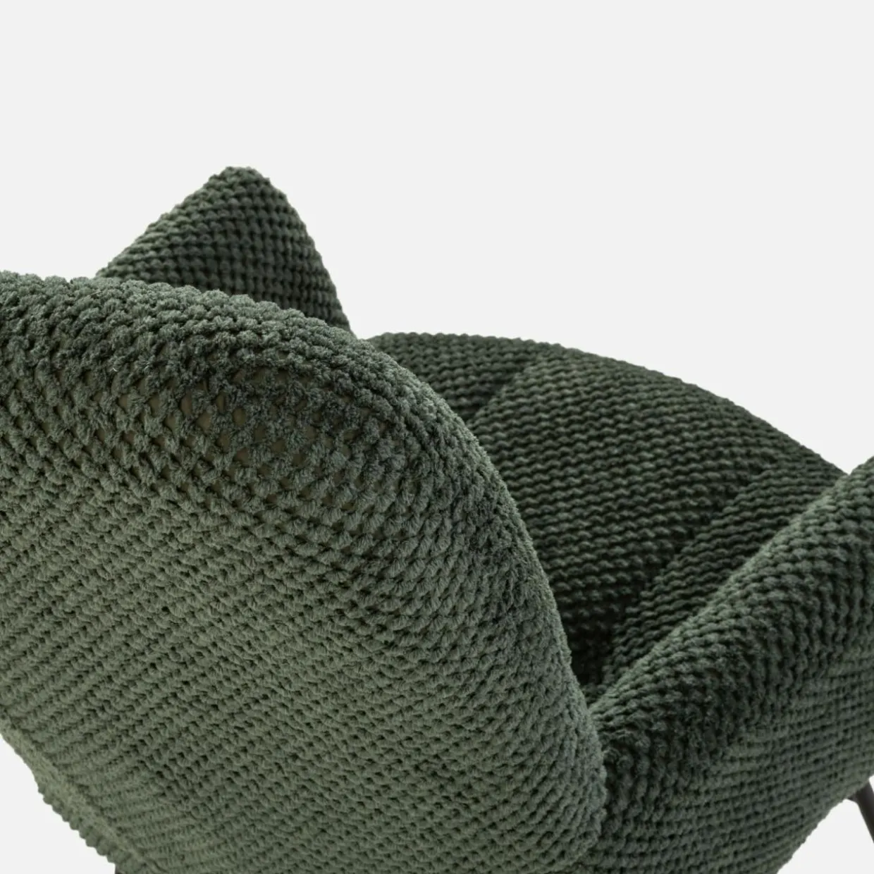 - Zielona tkanina o ciekawej strukturze sprawia, że fotel świetnie wpisze się do wnętrz retro.