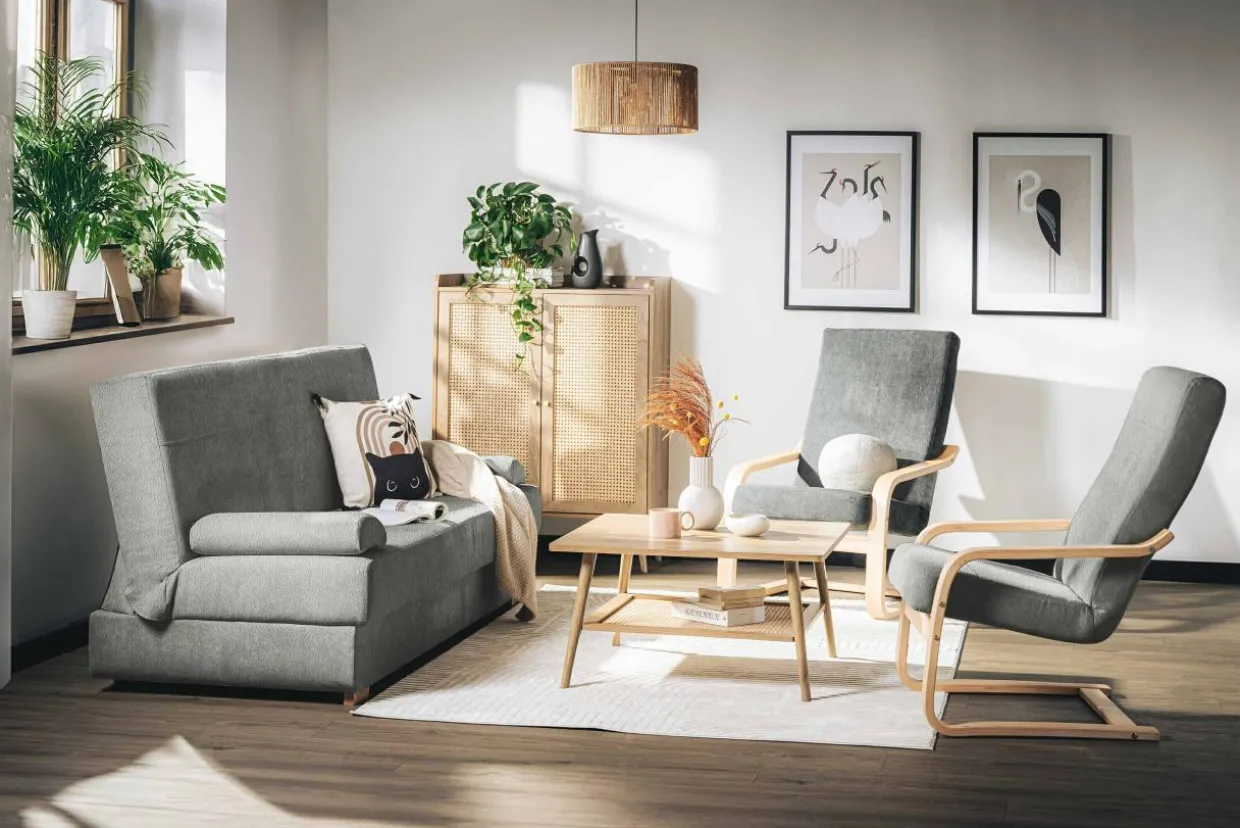 Bukowe drewno w kolorze naturalnym w połączeniu z ciekawą tkaniną tworzą wspaniałe zestawienie.