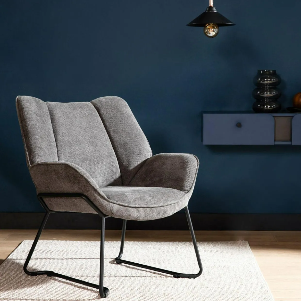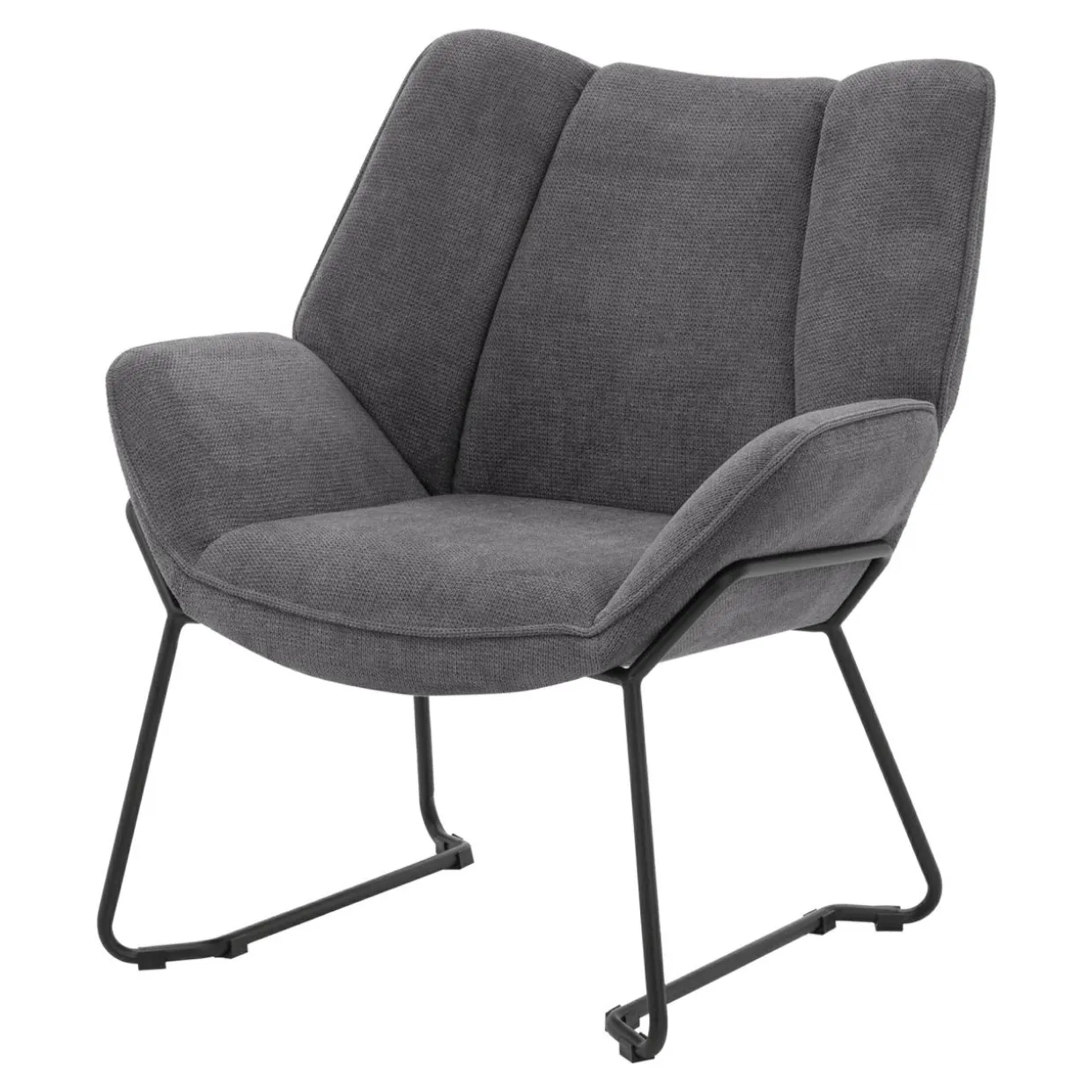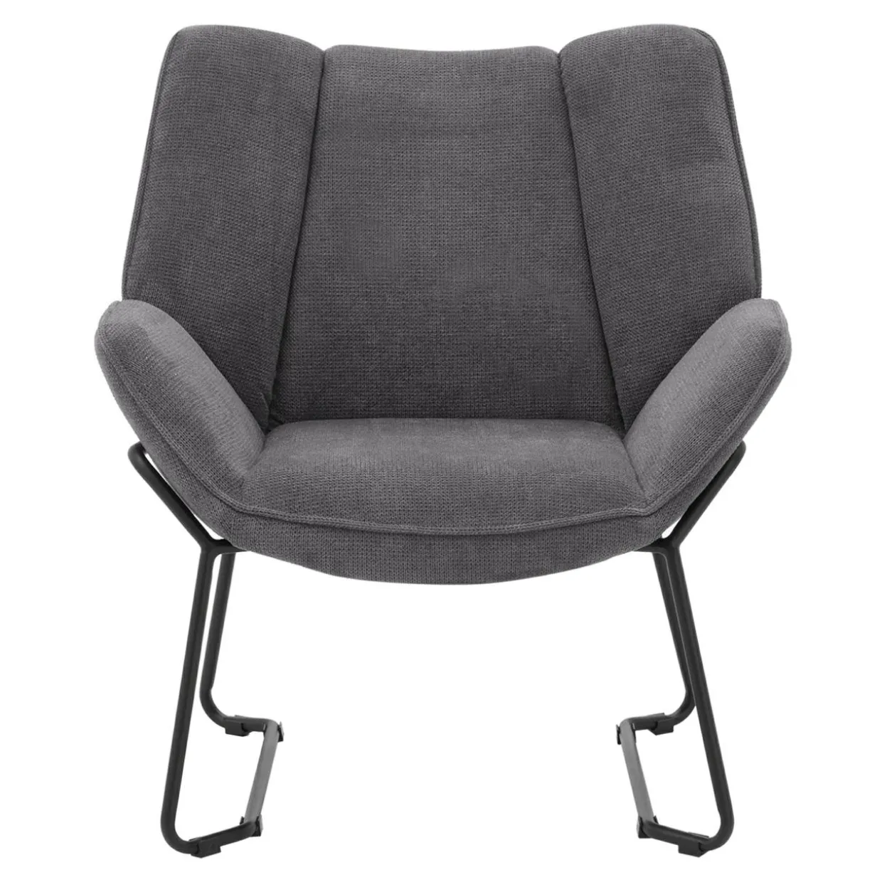 Strukturalna tkanina i czarne, metalowe płozy to ciekawy akcent, nawiązujący do stylu retro. Fotel świetnie zaprezentuje się także w minimalistycznych i industrialnych aranżacjach.