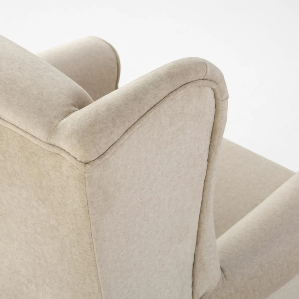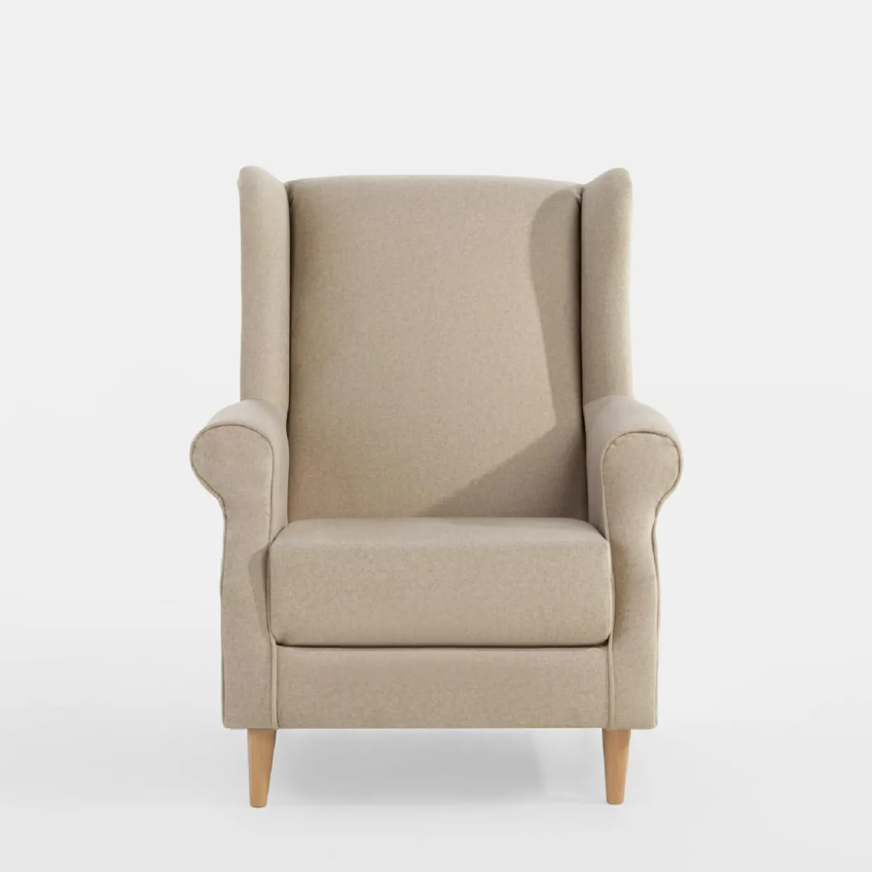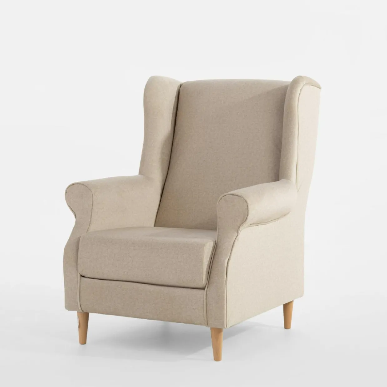Fotel SERENA ma klasyczny kształt uszaka – urządzisz z nim przytulny kącik w salonie. Połączenie jasnobeżowego weluru i drewnianych nóżek będzie pasować do salonu urządzonego w stylu skandynawskim lub retro.