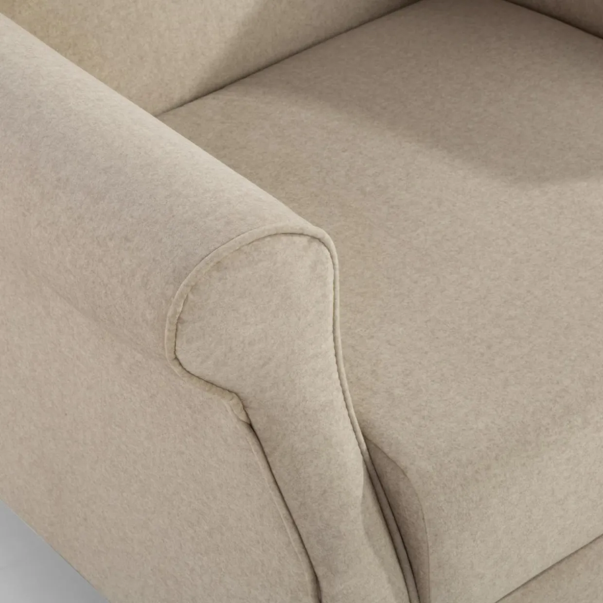 - Welur w jasnobeżowym kolorze i drewniane nóżki nadają fotelowi lekkości, dzięki czemu nie przytłoczy wnętrza.