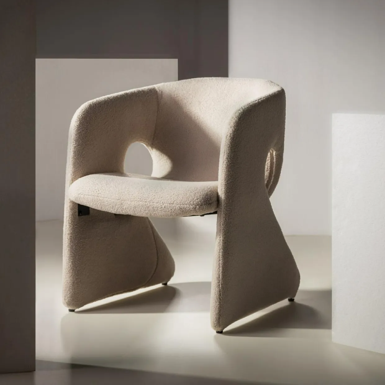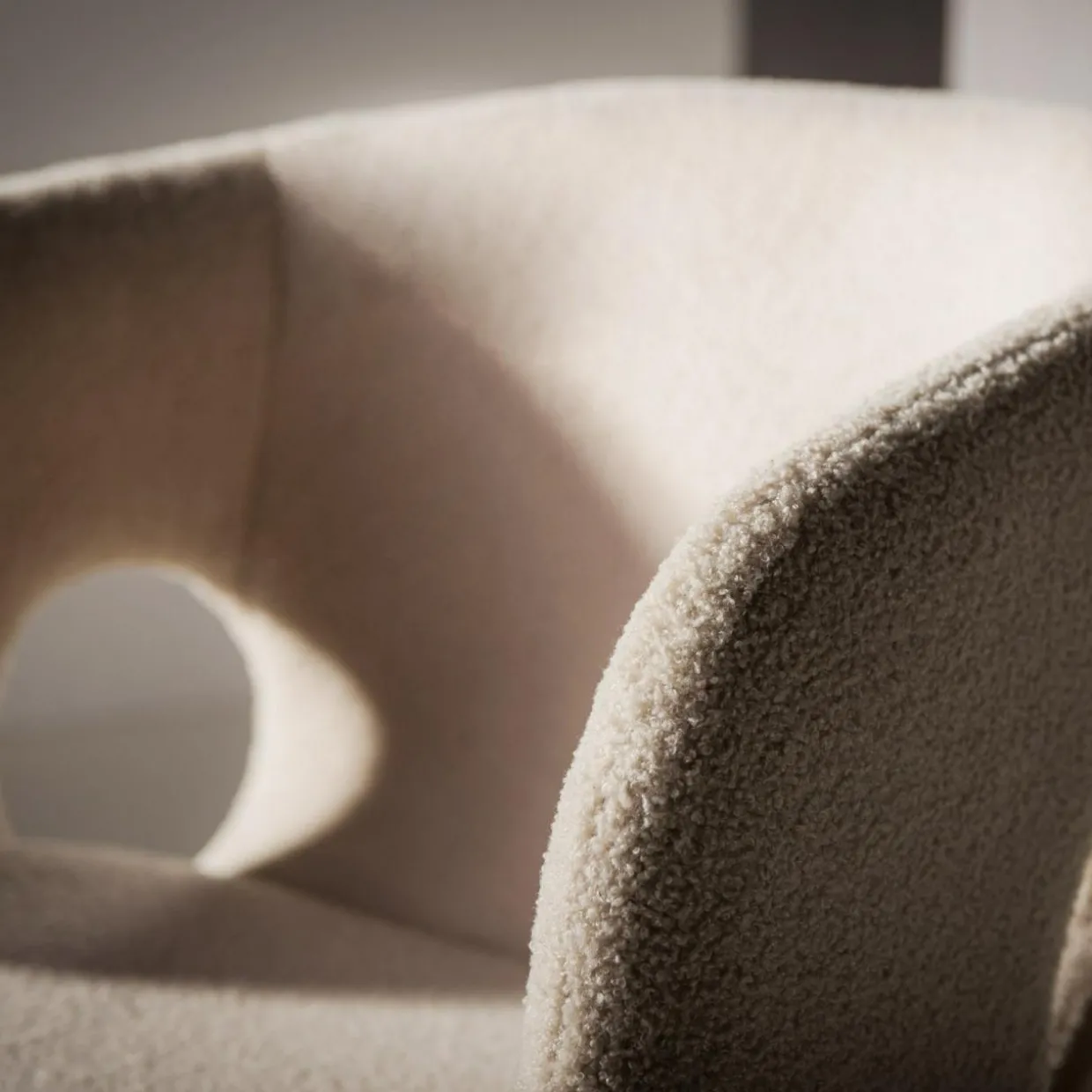 - Fotel pokryto miłą w dotyku tkaniną boucle w odcieniu beżowym. Siadając na nim, poczujesz przyjemną miękkość.